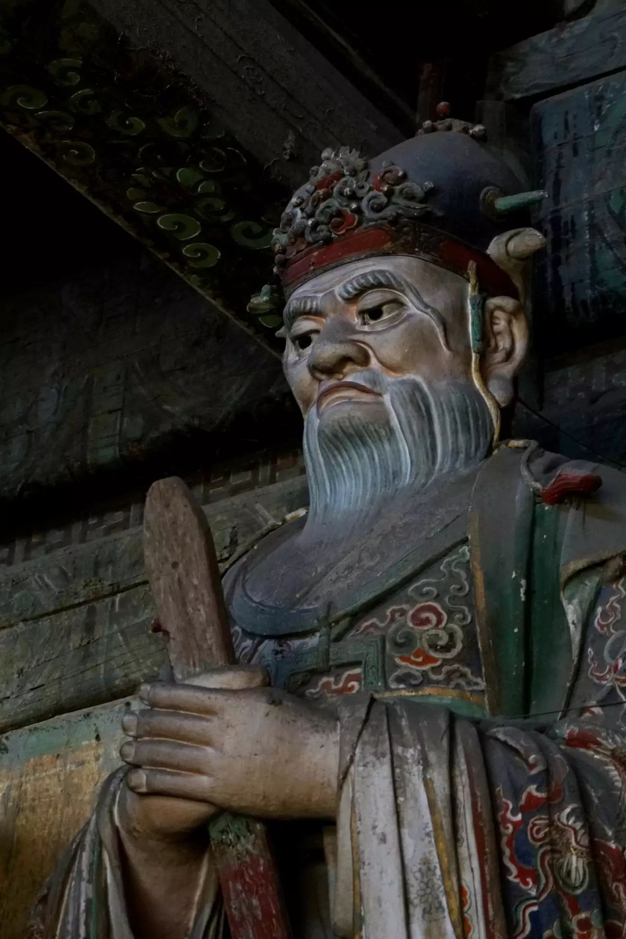 在初步认定28尊彩色塑像名号的过程中,发现其组合排列及群体布局的构成,构思周密。不仅如此,在那缜密的思考中还注入了宗教宣传的功利意图。比如,是将帝后、文官武将、容貌修好的世俗裙钗、面目狰狞的神话人物穿插排列,使一字排开的众多塑像个体,在形式感上有着动静、收放、文野于服饰华丽或简约的对比变化,一方面减弱了所有塑像都以端正严肃的站立姿势,平均排列在须弥座上,把可能产生的呆板、单调的排列变成为有节奏变化的构成。