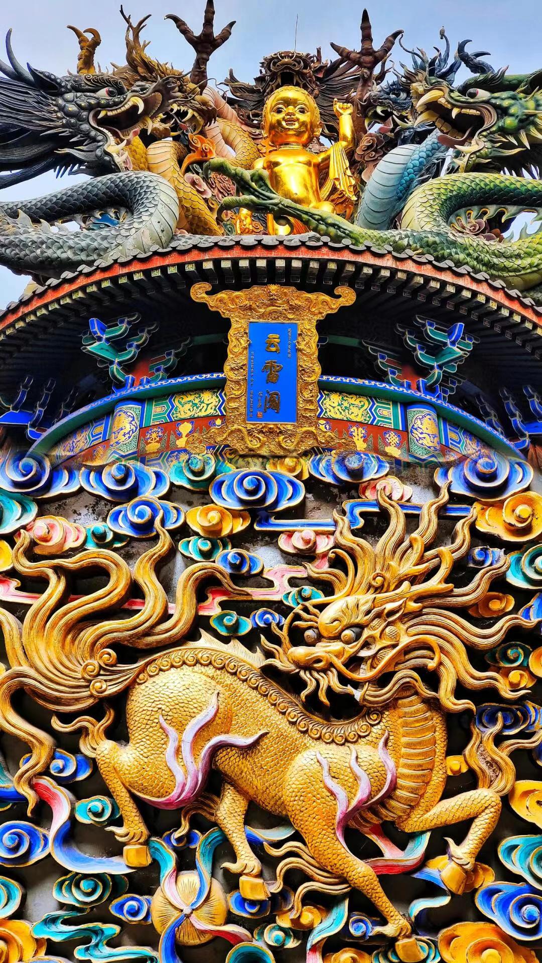 这座云雷阁建在一座水池之上,正中安放着一口大钟。它的雕塑极为特别,有代表五行的青赤黄蓝黑五色巨龙盘绕其上,左右还各有两只凤凰环绕,都寓意着吉祥如意。正上方有一尊金色的孩童塑像,其再现的是佛祖释迦摩尼出生时,一手指天,一手指地的场景。云雷阁内悬挂的365平安大钟,耗时三年铸成。“其重五十六吨、象征中华五十六个民族,直径3.65米、寓意众生365天风调雨顺、国泰民安。此钟比大钟寺内永乐大钟还要重9.5吨,堪称华北第一钟”。