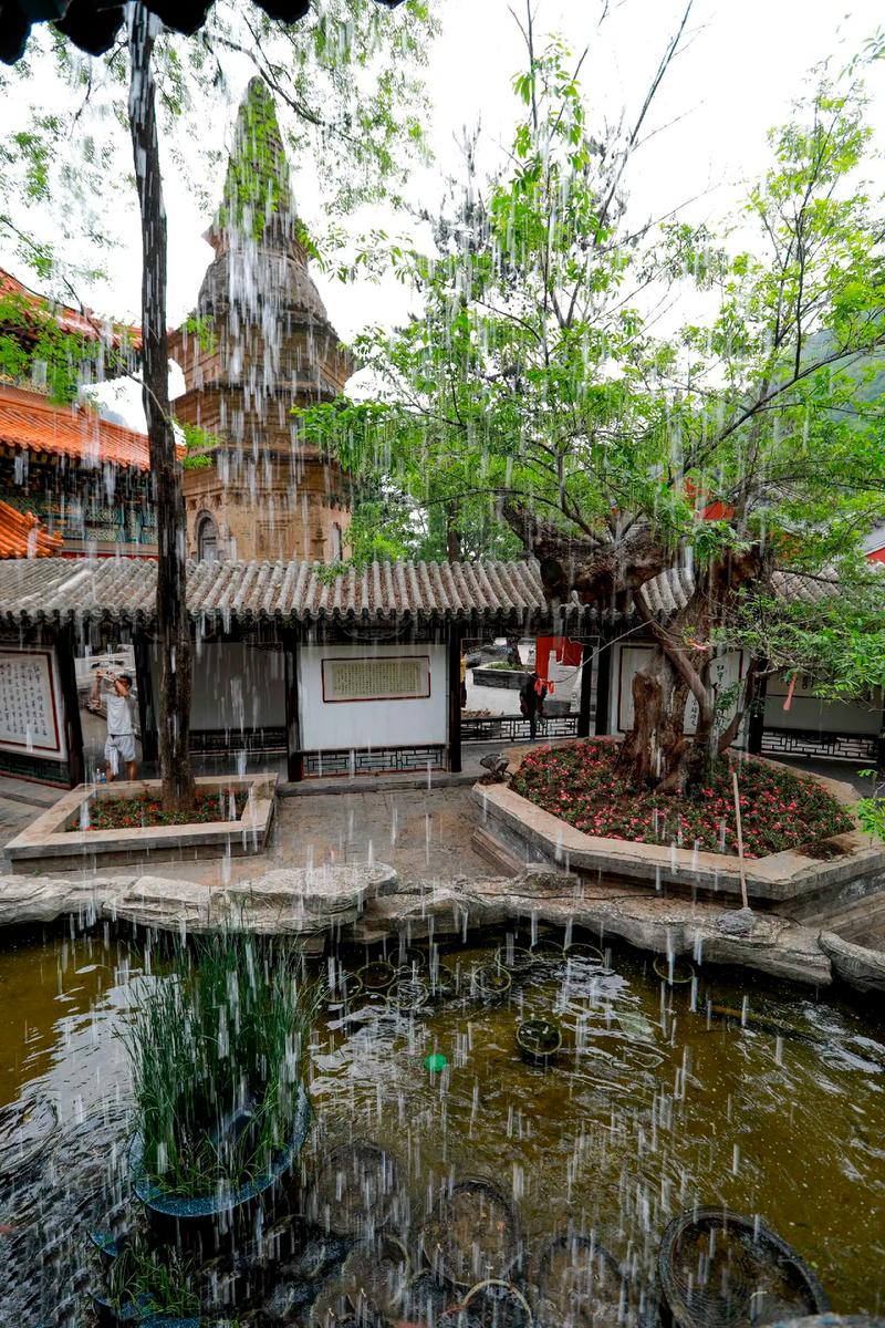 这座云雷阁建在一座水池之上,正中安放着一口大钟。它的雕塑极为特别,有代表五行的青赤黄蓝黑五色巨龙盘绕其上,左右还各有两只凤凰环绕,都寓意着吉祥如意。正上方有一尊金色的孩童塑像,其再现的是佛祖释迦摩尼出生时,一手指天,一手指地的场景。云雷阁内悬挂的365平安大钟,耗时三年铸成。“其重五十六吨、象征中华五十六个民族,直径3.65米、寓意众生365天风调雨顺、国泰民安。此钟比大钟寺内永乐大钟还要重9.5吨,堪称华北第一钟”。