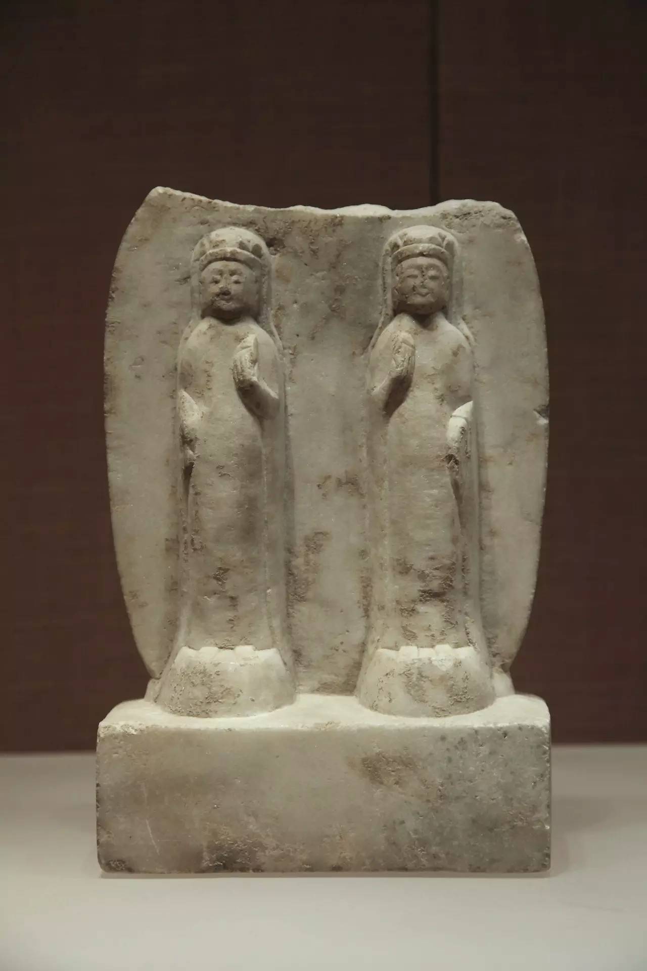 北齐武平五年_石雕二菩萨像 北齐时期,鲜卑统治者提倡和重视本民族文化,佛像艺术又回复到北方民族审美标准上来。佛像的体态由修长变为矮胖,腹部前凸;面相由瘦削变为丰圆;衣服由厚重变为轻薄;衣纹由密集相重,变为疏朗浅细。这尊佛像体现了北齐造像的鲜明特点。