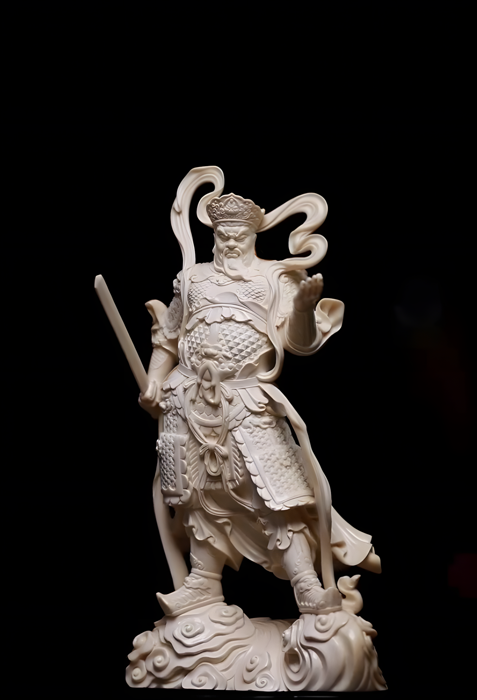 【四大天王造像】 精工手雕造像,衣甲细节丰富,形神刻画生动,四大天王各执法器,气度庄重威严,极具动感与神采张力。