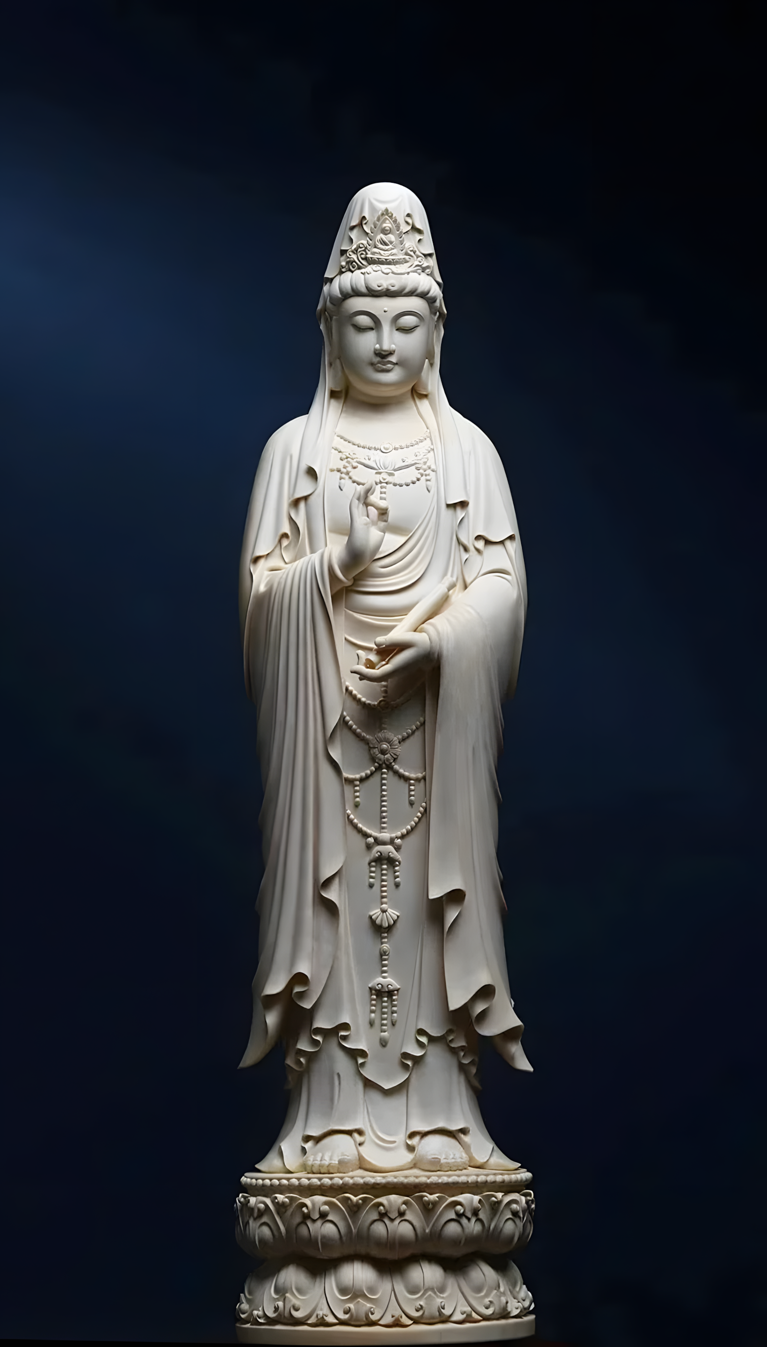 【南海观音】 菩萨立像头束高髻,戴化佛冠, 头戴帔巾,项饰璎珞,身着法衣, 绣袍宽大,褶皱自然。面相丰满, 神态自然安详,立於莲台之上。 <div><br></div>