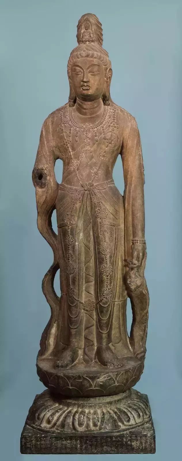 此像为唐代精美石雕造像。观音菩萨头绾高髻,髻上有化佛。斜披络腋,披帛呈波浪状垂于体侧。华美的项饰、璎珞及手镯等雕刻较浅。左手下垂持净瓶,右下臂毁损。下身著贴体长裙,双腿轮廓明显,跣足立于束腰仰覆莲台之上。身躯直立挺拔、健硕丰美,衣饰繁复华丽,显示出盛唐时期造像优美的气势与结构。此像正面及两侧皆有阴刻铭文,唐代菩萨立像刻有铭文者十分罕见。