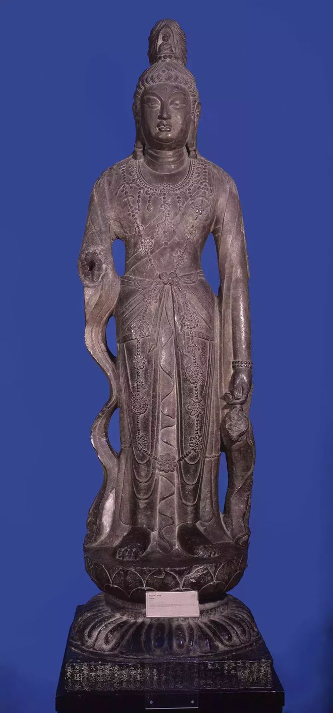 此像为唐代精美石雕造像。观音菩萨头绾高髻,髻上有化佛。斜披络腋,披帛呈波浪状垂于体侧。华美的项饰、璎珞及手镯等雕刻较浅。左手下垂持净瓶,右下臂毁损。下身著贴体长裙,双腿轮廓明显,跣足立于束腰仰覆莲台之上。身躯直立挺拔、健硕丰美,衣饰繁复华丽,显示出盛唐时期造像优美的气势与结构。此像正面及两侧皆有阴刻铭文,唐代菩萨立像刻有铭文者十分罕见。