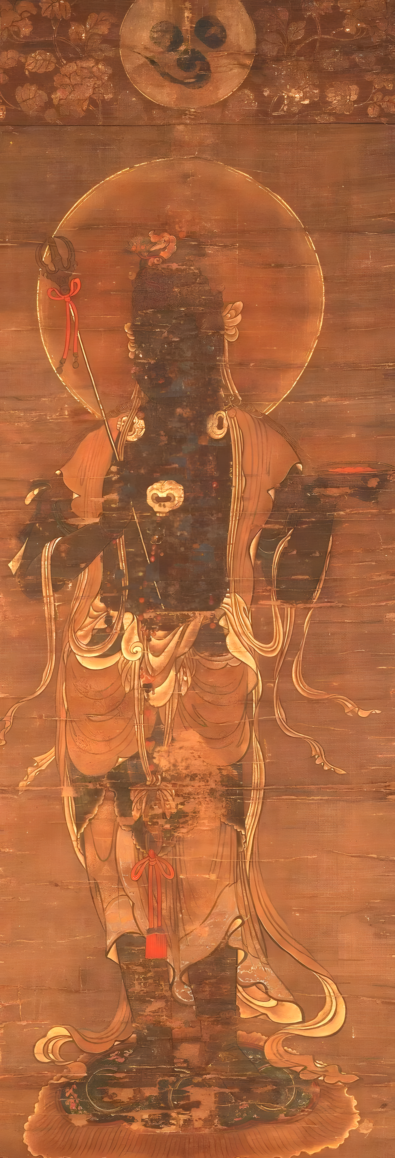 十二天,原为古印度神,后被佛教引入成为护法神。先由帝释天(东)、火天(东南)、焰摩天(南)、罗刹天(西南)、水天(西)、风天(西北)、毗沙门天(北)、伊舍那天(东北)这些天尊守护各方位组成八方天,加上梵天(天)、地天(地)、日天(日)和月天(月),成为十二天。奈良西大寺在日本最早绘制十二天像,其后于大治2年(1127),京都东寺本同时绘制五大尊像。它们曾被用于后七日御修法(gosichinichimishiho)等密教大法。本图所示的是脚踩荷叶座、毛毡座和涌云,上部标有种子字(syji)的是用于灌顶(kanjyou)仪式的十二天屏风样式,据称从平安时代后期起其取代十二天道而被悬挂,此前的作品有建久2年(1191)制作的东寺藏诧磨胜贺笔本、京都神护寺、滋贺众圣来迎寺本等。本图大概也曾是装饰屏风吧。
