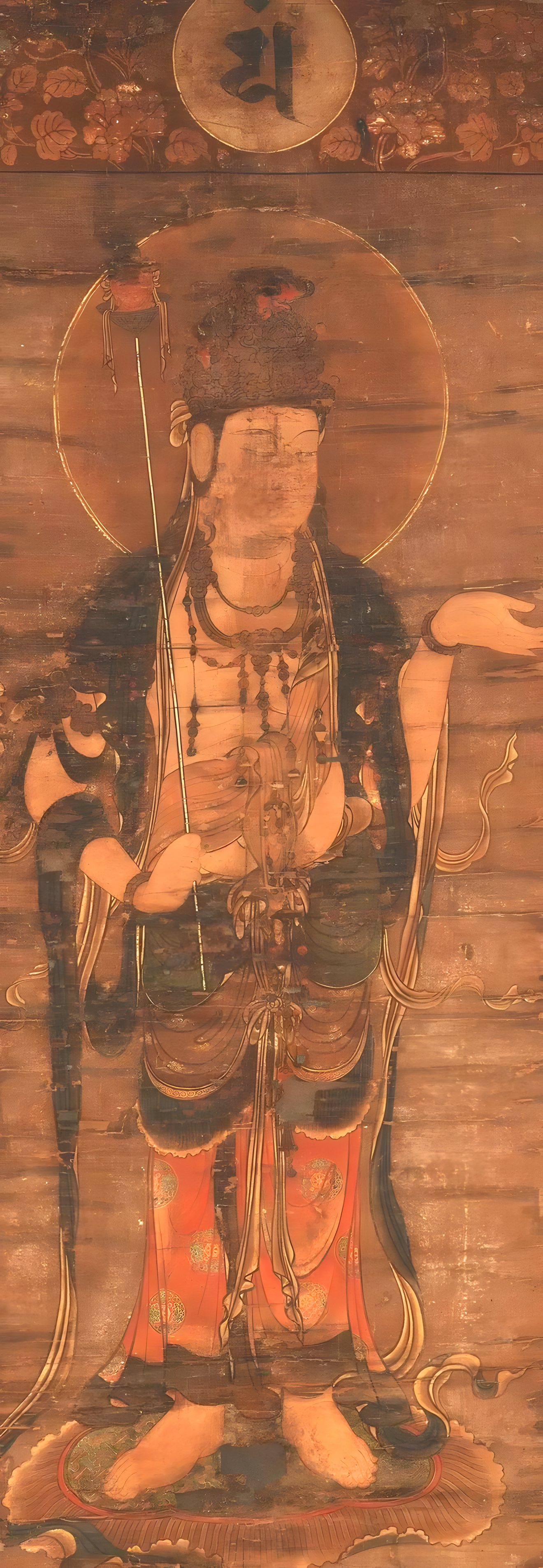 十二天,原为古印度神,后被佛教引入成为护法神。先由帝释天(东)、火天(东南)、焰摩天(南)、罗刹天(西南)、水天(西)、风天(西北)、毗沙门天(北)、伊舍那天(东北)这些天尊守护各方位组成八方天,加上梵天(天)、地天(地)、日天(日)和月天(月),成为十二天。奈良西大寺在日本最早绘制十二天像,其后于大治2年(1127),京都东寺本同时绘制五大尊像。它们曾被用于后七日御修法(gosichinichimishiho)等密教大法。本图所示的是脚踩荷叶座、毛毡座和涌云,上部标有种子字(syji)的是用于灌顶(kanjyou)仪式的十二天屏风样式,据称从平安时代后期起其取代十二天道而被悬挂,此前的作品有建久2年(1191)制作的东寺藏诧磨胜贺笔本、京都神护寺、滋贺众圣来迎寺本等。本图大概也曾是装饰屏风吧。