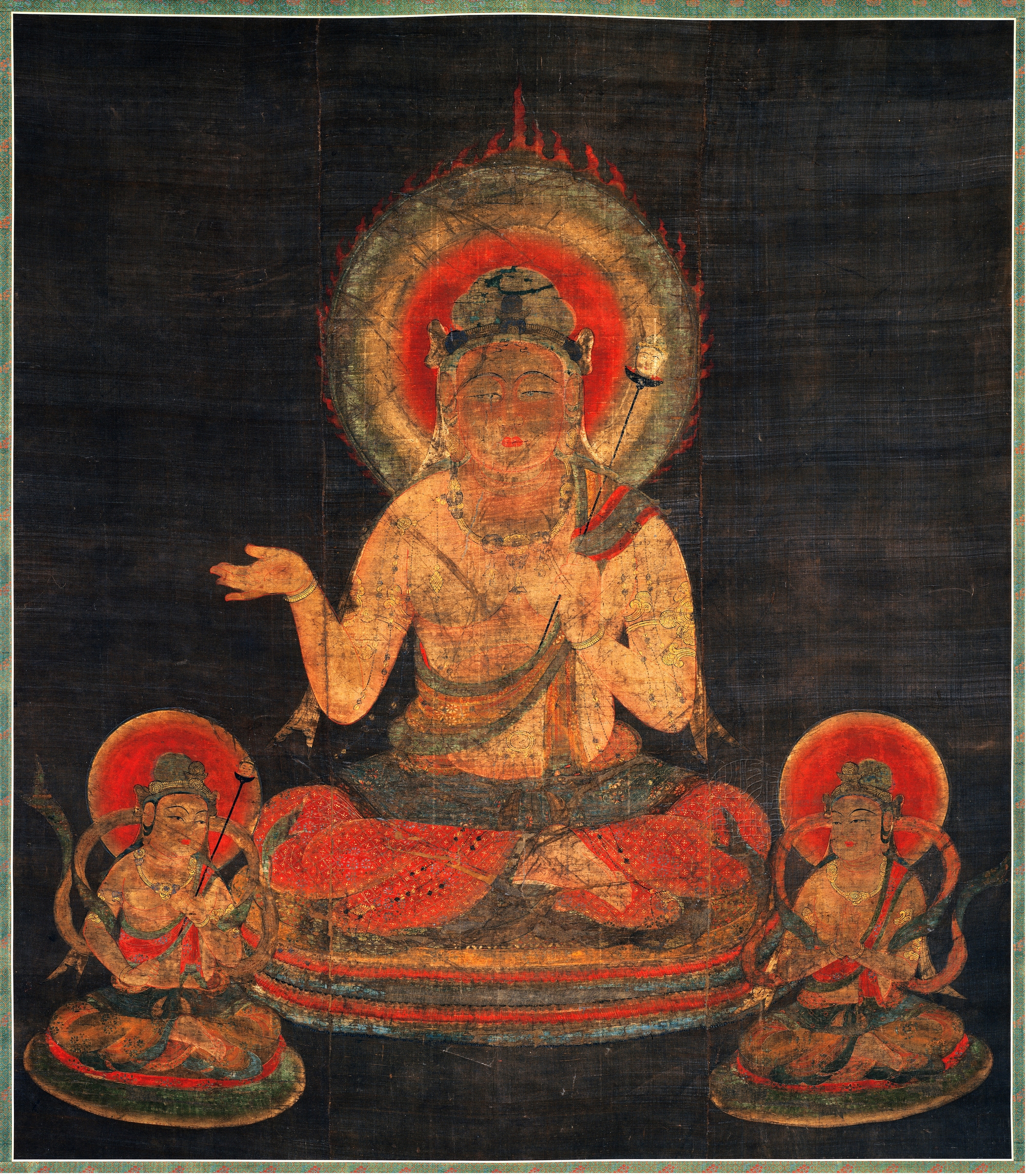本幅阎魔天像,是宫中真言院为了每年正月所举办的“御七日修法”活动,于大治2年(1127)所绘制的十二天像之一,原为教王护国寺所藏。十二天,是八方、天地以及日月的守护神,阎魔天是守护南方之神,右手手掌向上,左手持人头幢。阎魔天以慈悲相表现,身上披挂的华丽装饰品,都用金银箔加以妆点。
