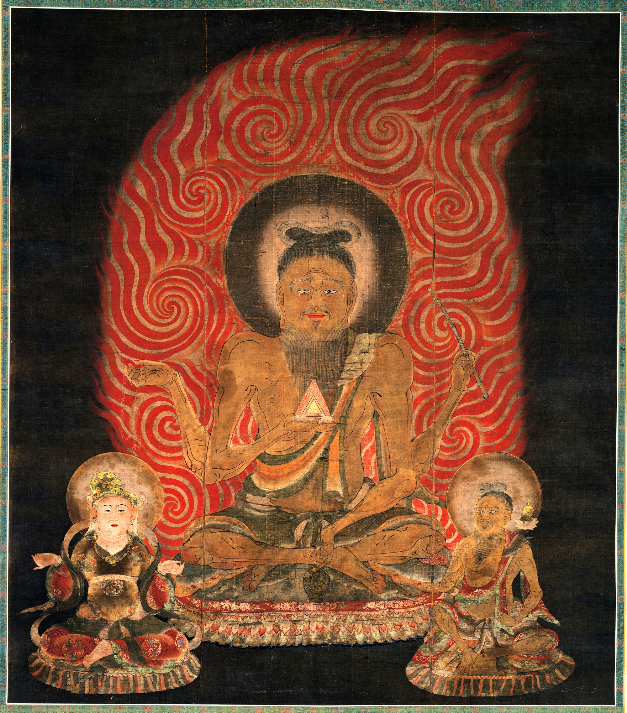 本幅火天像,是宫中真言院为了每年正月所举办的“御七日修法”活动,于大治2年(1127)所绘制的十二天像之一,原为教王护国寺所藏。十二天,是八方、天地以及日月的守护神,火天是守护东南方之神。火天经常以表情严肃的老人形象呈现,本幅的火天却显得温和而亲切。