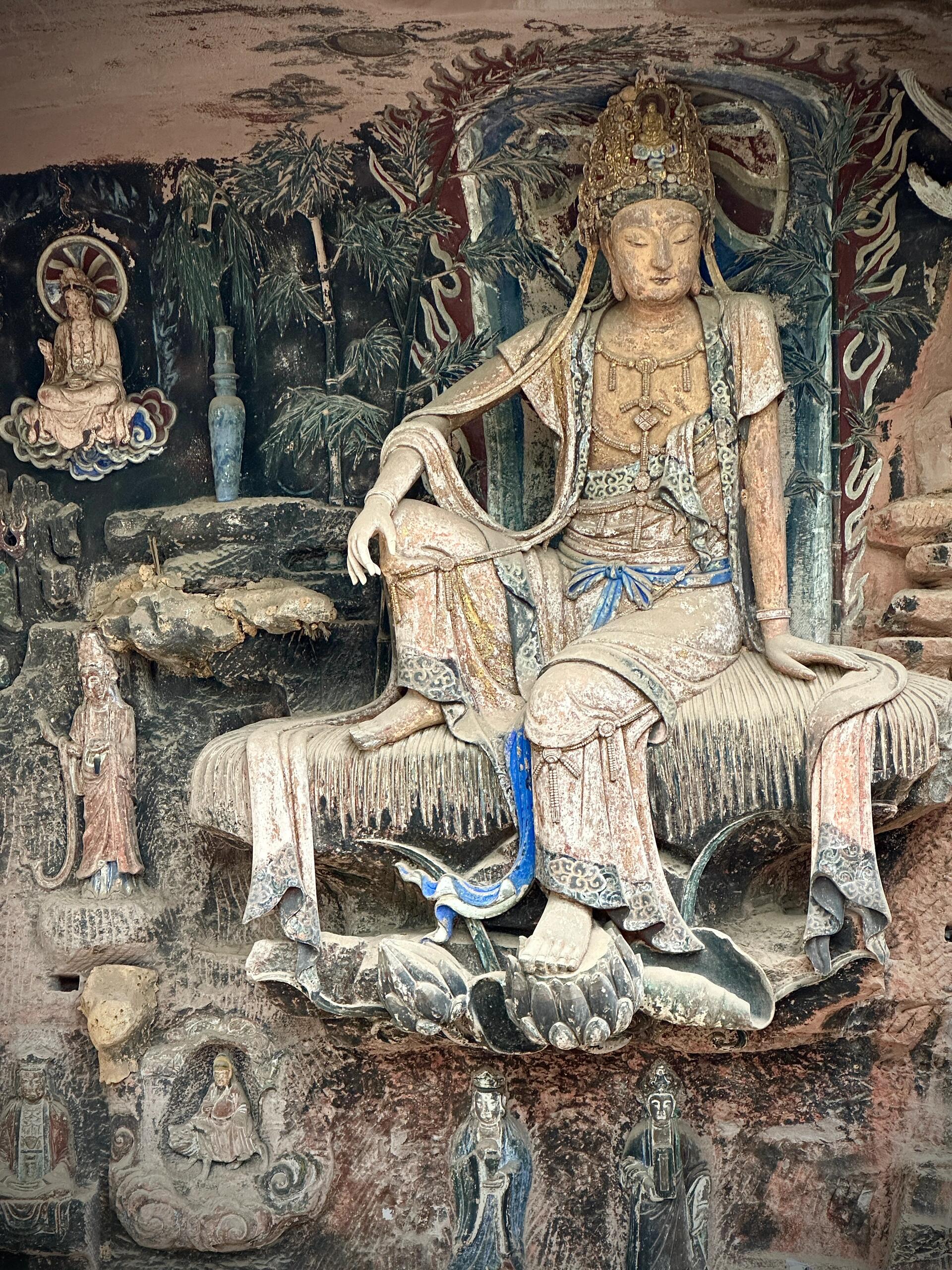 安岳石窟开凿于启始于南梁武帝普通二年(公元521年),盛于唐宋两代,延续至明清直到民国,几乎每个乡都有大型石窟造像遗址,为民间结社造像,其中以佛教石窟为主,也有部分道教造像,三教合一的造像也不在少数,安岳石窟拥有几大之最:最大的唐代左侧石刻卧佛以及21万字石刻佛经、中国最精美的观音经变像-----毗卢洞北宋紫竹观音、唐代最大的道教石刻群——玄妙观、五代最集中的石窟群——庵堂寺等,安岳石窟除少数遭受自然人为破坏妆彩外,大部分保存完好,特别是宋代造型更是达到中国石窟艺术的巅峰,具有很高的观赏价值。