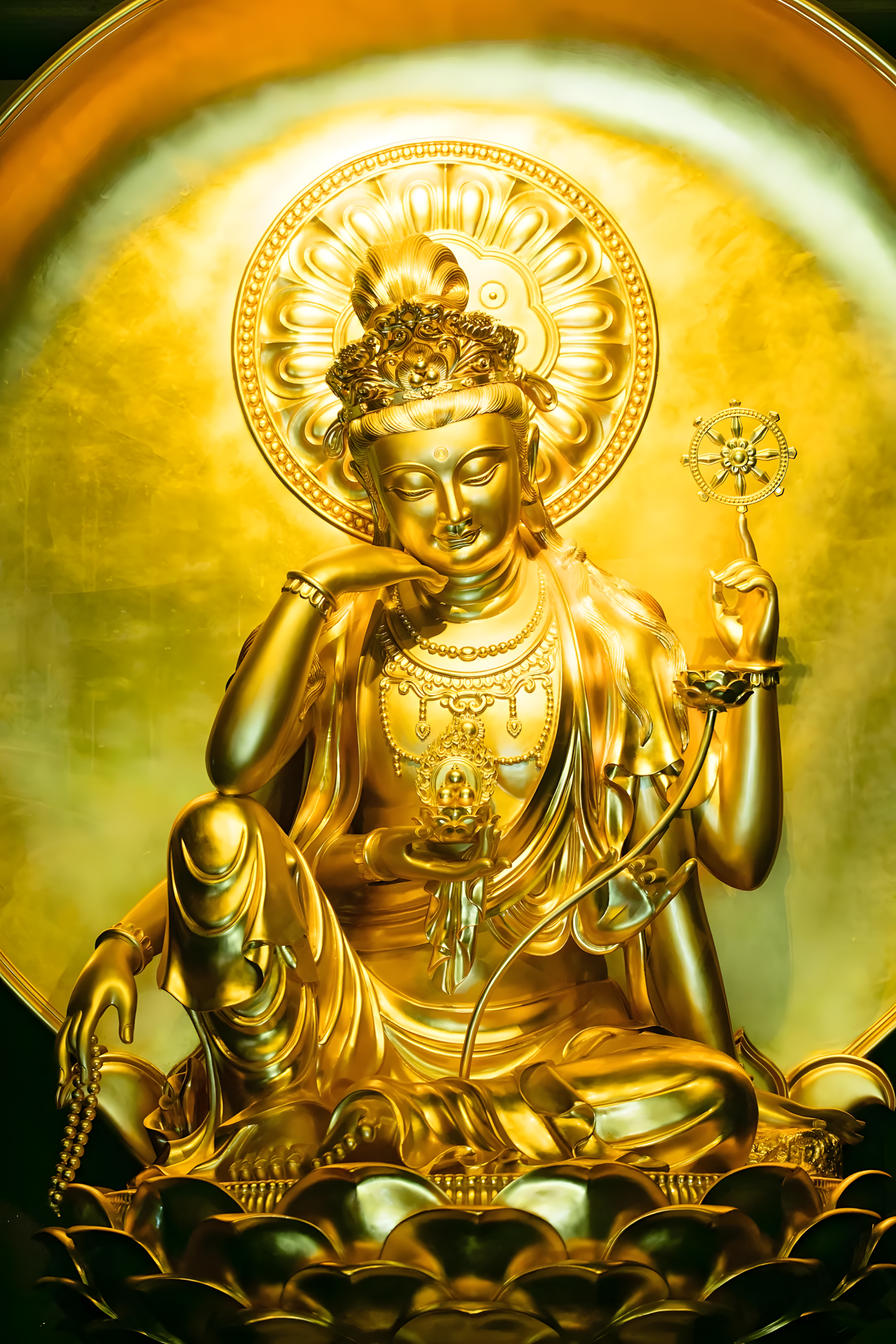 如意轮观音菩萨,梵名 Cintāmanicakra。观世音菩萨变化身之一, 主破天道三障,属六观音中的救度天道众生,列于莲花部。其形相一般为六臂像,至于手持宝物及印相,则依经轨的不同而有多种差异。如意轮观音菩萨对应天台宗“大梵深远观世音”。全称如意轮观世音菩萨。又作如意轮菩萨、如意轮王菩萨。而之所以名为「如意轮观音」,主要是因其形象是左右手分持宝珠及轮宝,故名为意轮,密宗称其为「持宝金刚」。如意轮观音菩萨右边的第一手,主要是用于思维;第二手是用于持如意;第三手是持念珠。而左边的第一手,则是按明山;第二手持莲花, 第三手是持宝轮。这六臂的功能,主要都是在于解除众生的烦恼。此菩萨安置于密教现图胎藏界曼荼罗观音院中,密号为持宝金刚,三昧耶形为如意宝珠。其形像有二臂、四臂、六臂、八臂、十臂、十二臂等不同。其中,具有二臂之如意轮观音像,为密教以前之佛像,与六臂如意轮观音广为世人所崇奉。