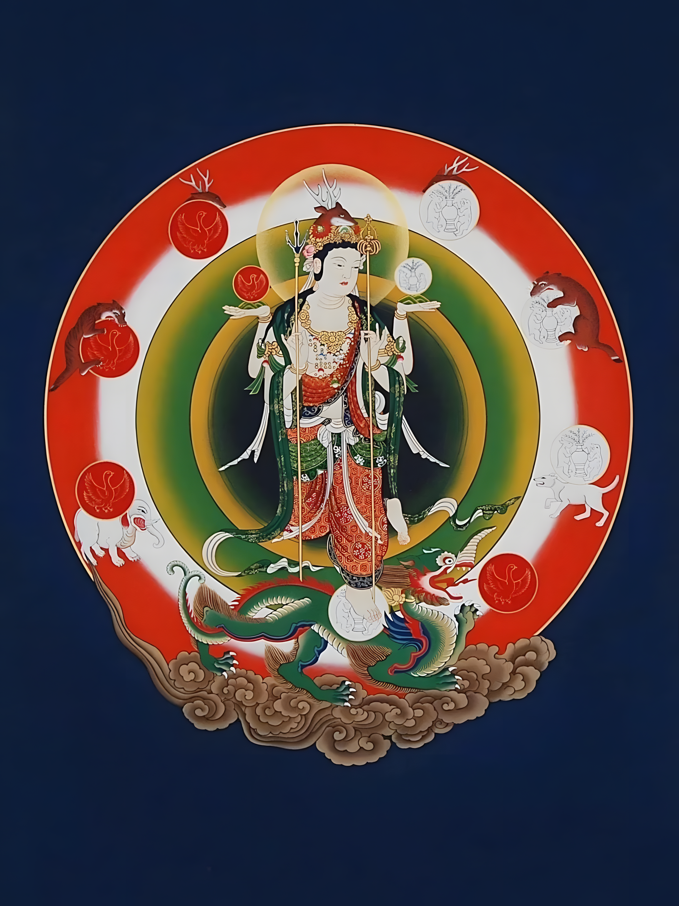 北辰妙见菩萨,为密教一重要大法,此位菩萨能护四天下,统领万国,可以让一个国家不称职的国王退位,让行持正法的国王登基管理国家。他是诸星中的最胜,诸星之王,能护国,消除天灾人祸,自然灾害,令国泰民安。经典中说:时当率诸大天王诸天帝释。伺命都尉天曹都尉。除死定生灭罪增福益算延寿。白诸天曹差诸善神。一千七百逻卫国界。守护国土除其灾患灭其奸恶。风雨顺时谷米丰熟。疫气消除无诸强敌。人民安乐称王之德。