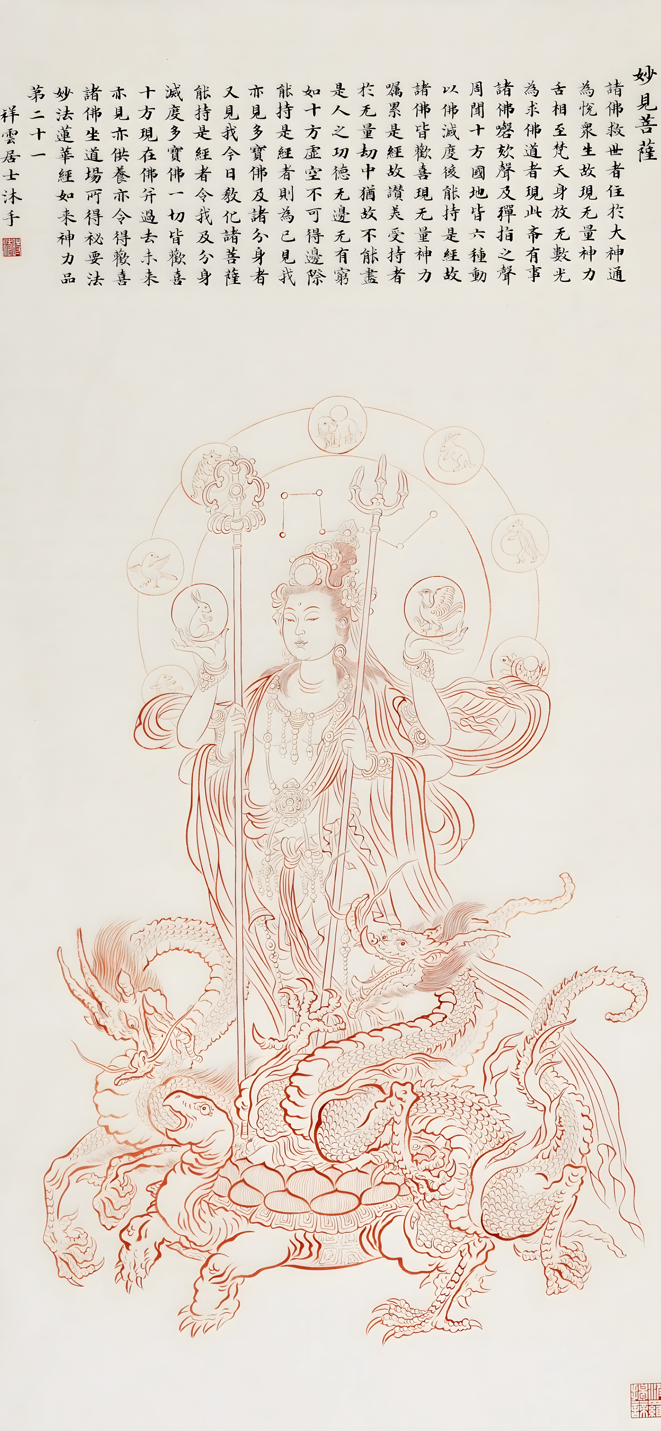 据《妙见菩萨神咒经》载,密宗用以显示妙见菩萨内证之曼荼罗(坛场)称“妙见曼荼罗”。其图式为:于中央大月轮中绘妙见菩萨为中尊,此为内院之众。北斗七星顺次为西南贪狼星、西面巨文星、西北禄存星、北面文曲星、东北廉贞星、东面武曲星、东南破军星。妙见菩萨这前置一宝轮。外院依方位顺序绘有东方寅位之甲寅将军、卯位之丁卯将军、辰位之甲辰将军;南方巳位之丁巳将军、午位之甲午将军、未位之丁未将军;西方申位之甲申将军、酉位之丁酉将军、戌位之甲戌将军;北方亥位之丁亥将军、子位之甲子将军、丑位之丁丑将军。四角四门皆以星作界。...