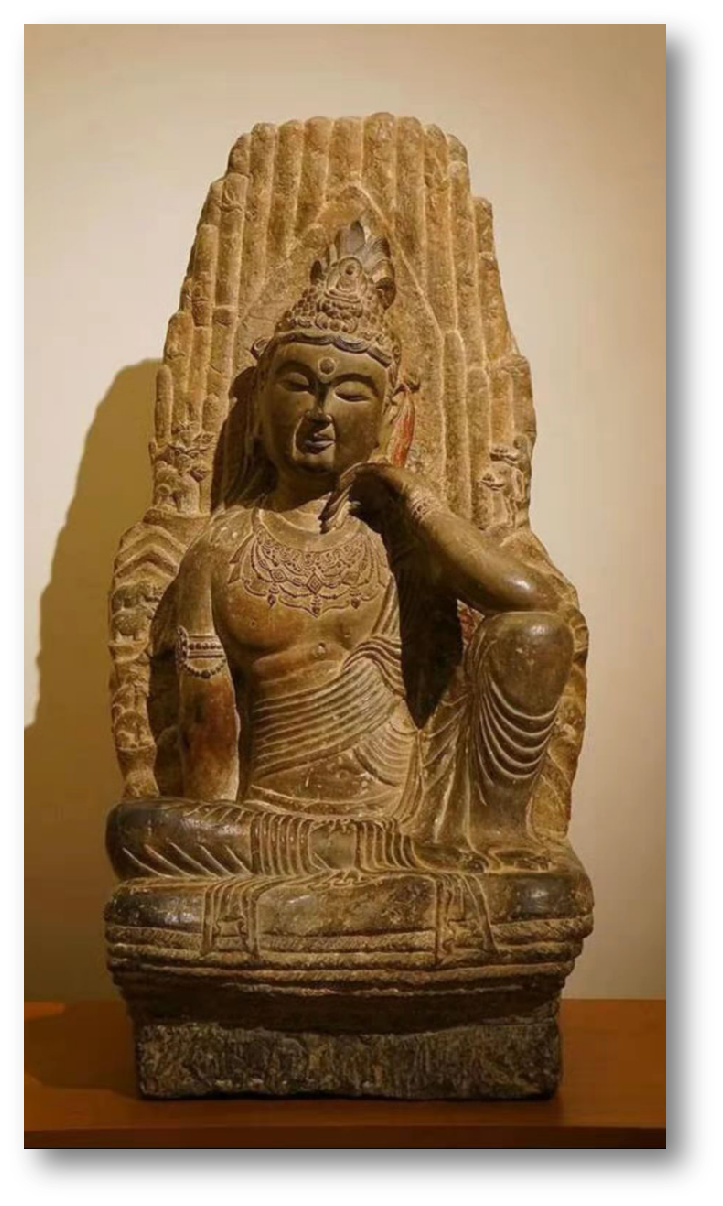 这是一尊收藏在法国巴黎吉美博物馆里的一尊宋代观音菩萨坐像,红砂岩石质雕刻。 这是一尊非常有特点的艺术风格非常高的坐像。造像很好的继承了唐朝的健美,又是宋代特有内敛的雅致。衣纹处理又很好的体现了秣吐罗的异域风情。身体结构准确,富有弹性的肌肤极具质感,是一尊难得的宋代石雕造像艺术珍品。 特别值得注意的是,这尊造像袒露的胸前佩戴的颈奢饰品的雕刻处理,其技法非常娴熟巧妙。它用深浅不同的浮雕技法表现出不同的饰品贴敷挂在胸前的质感,增加了造像的美感和真实性。