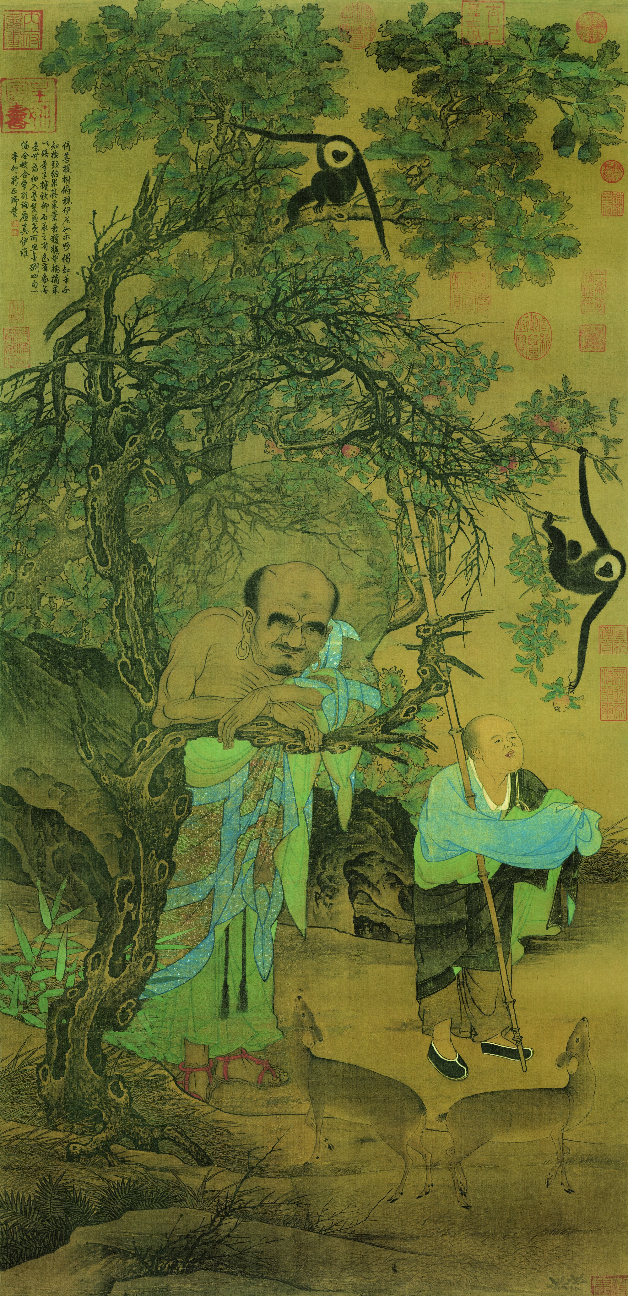 本院藏画中,有三幅刘松年画罗汉,每幅都款署「开禧丁卯(1207)刘松年画」,此轴即为其中之一。幅中罗汉浓眉高鼻,貌若印度高僧,身著右袒式袈裟,倚树沈思。身侧随侍的和尚以衣袂承接树上长臂猿所摘之石榴,身前尚有二鹿仰观,画面生动。此罗汉脸上满布皱纹,双眉蹙起,神情专注,栩栩如生。全作用笔变化多端,衣纹流畅罗汉头後的圆光,及三树枝柯掩映,层次分明。全画敷色妍丽,繁缛精美,皆臻绝纱。