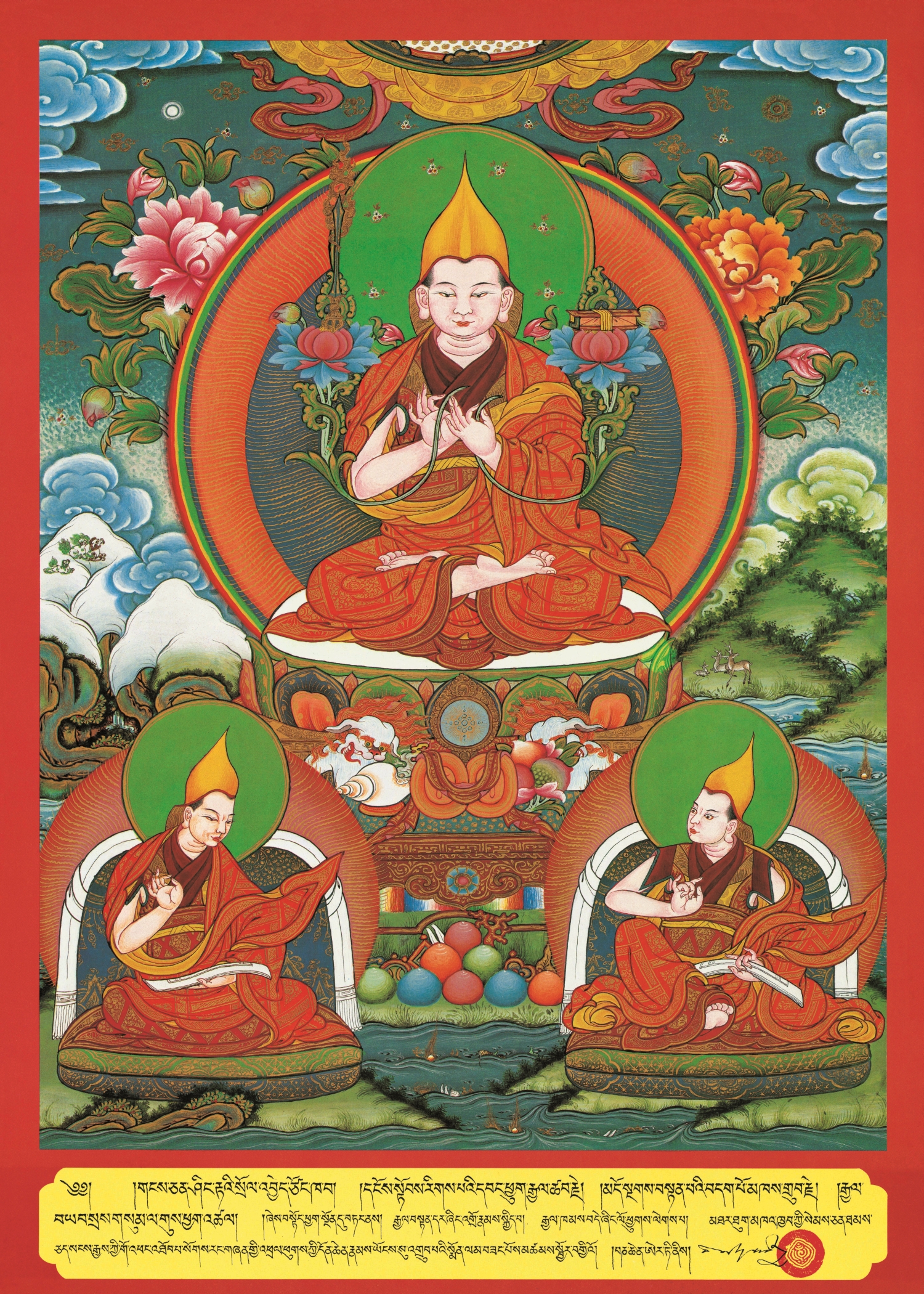 唐卡《宗喀巴父子三尊.宗喀巴大师右手边的就是贾曹杰,左手边的就是克珠杰,他们是宗喀巴大师两位非常了不起的弟子。