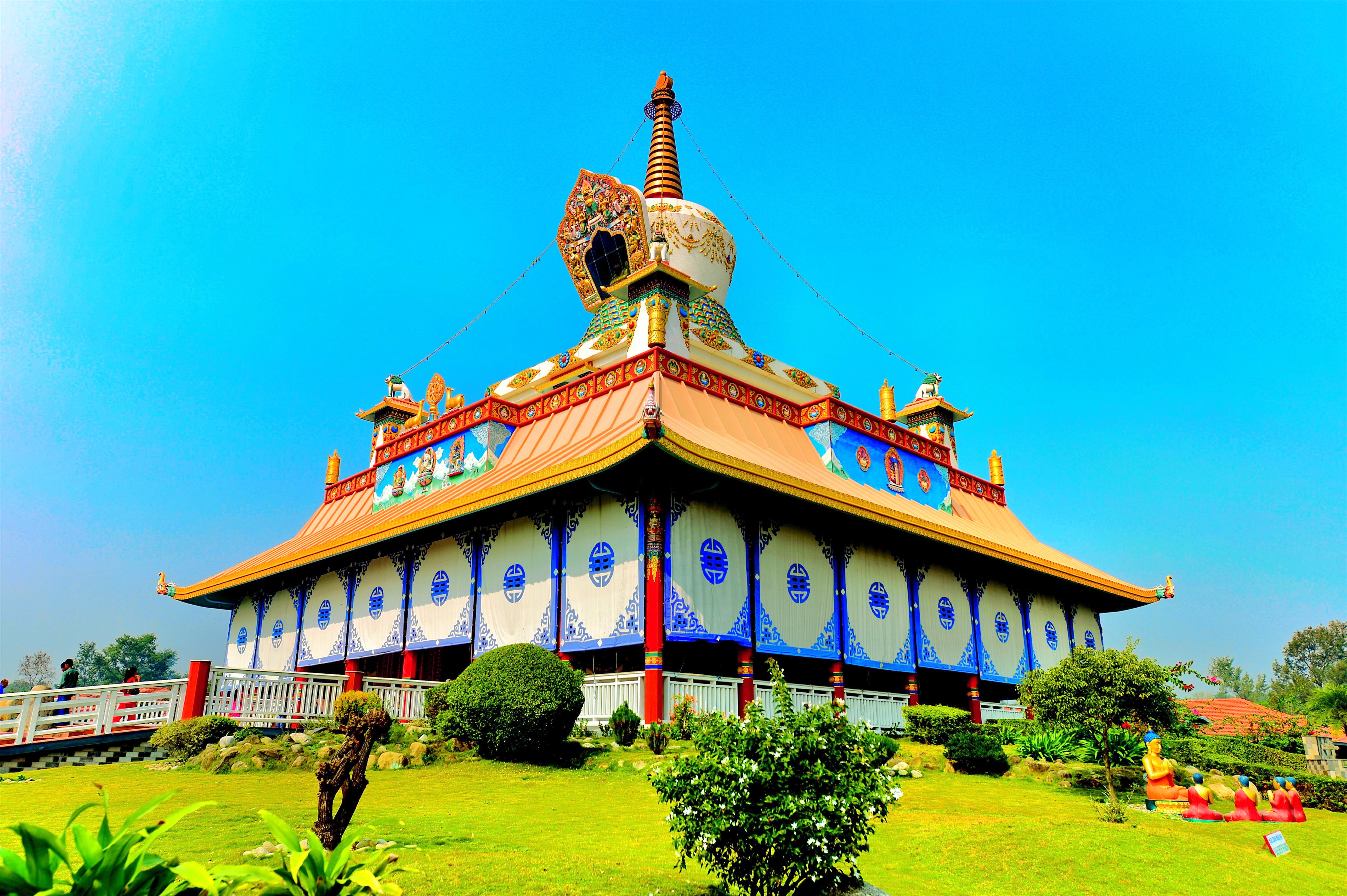 二千多年后,五洲四海的佛子回到这里,带着对佛陀的无比崇敬和对佛法传承的使命,建设起一座座各具特色的庄严的寺院,驻守着这片神圣的心灵家园。这些洋溢着各国风格的寺院成了蓝毗尼地区最显眼的风景。行人往蓝毗尼方向行进,可谓三十步一寺,五十步一庵,无人认识的树丛当中冒出一座建筑物的尖顶肯定是佛教寺院或塔。摩耶夫人的娘家受到了如此重视,跟释迦牟尼佛出生的地方和成长的地方的待遇大不相同,令人感慨不已。寺院区分为东西两个部分,目前已经有15个国家建起了27座寺院。东西区之间以一条人工开挖的小河为界,往南到蓝毗尼园圣火处,向北到靠近世界佛教图书馆的尼耐河。东区是南传佛教的寺院,来自泰国、缅甸、老挝等国家。西区则是北传佛教的寺院,来自尼泊尔、韩国、德国、法国等国。这些建筑自成一体,如果一千年后有人重新发现了这里,他们会看到十几座能够反映21世纪全球佛教文化的寺庙群遗址。