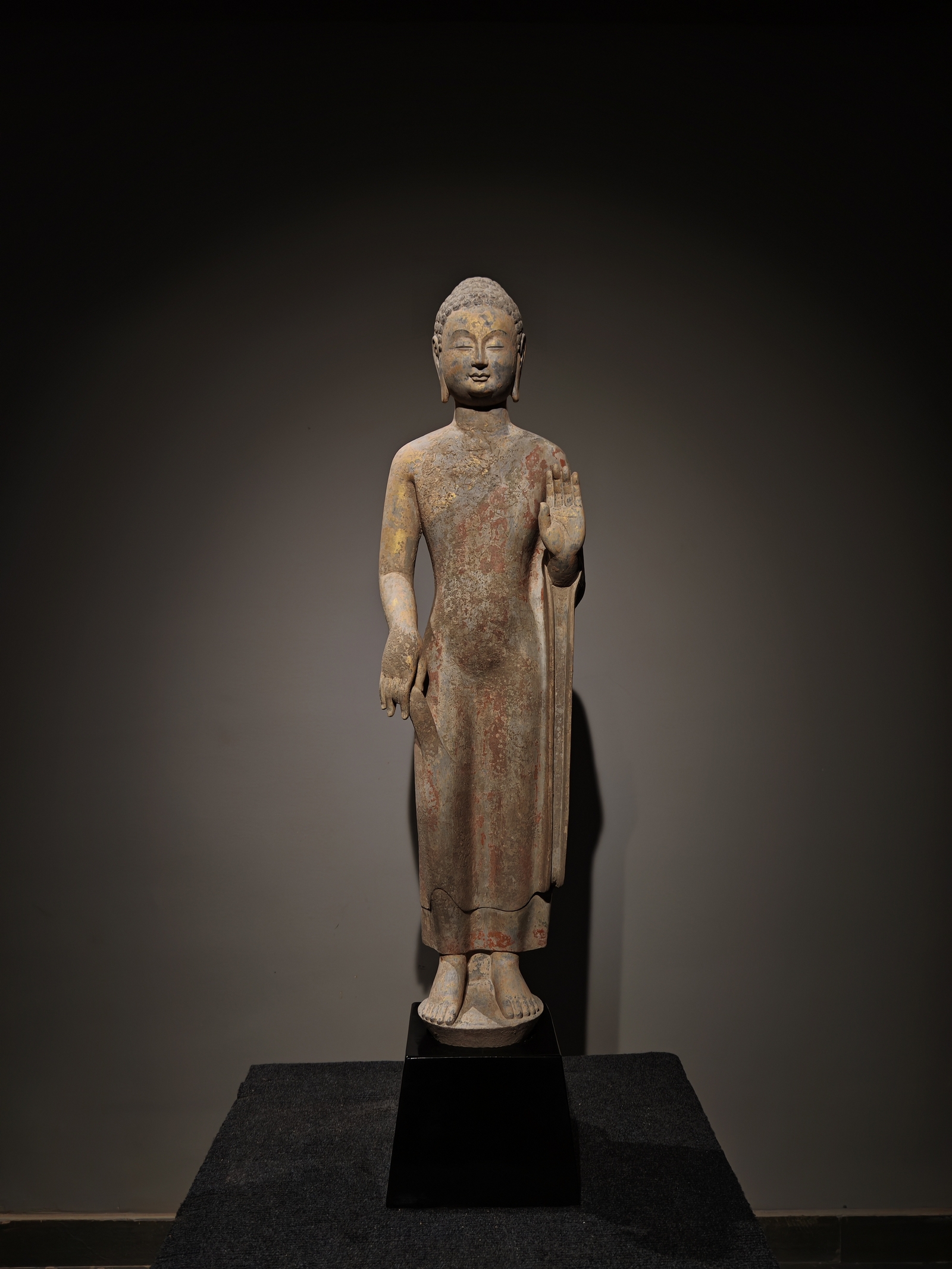 山东.青州.龙兴寺.石雕造像.4.北齐青州佛立像,青石整雕,贴金彩绘,脚面到头顶高约90厘米,带底座高约110,宽约27