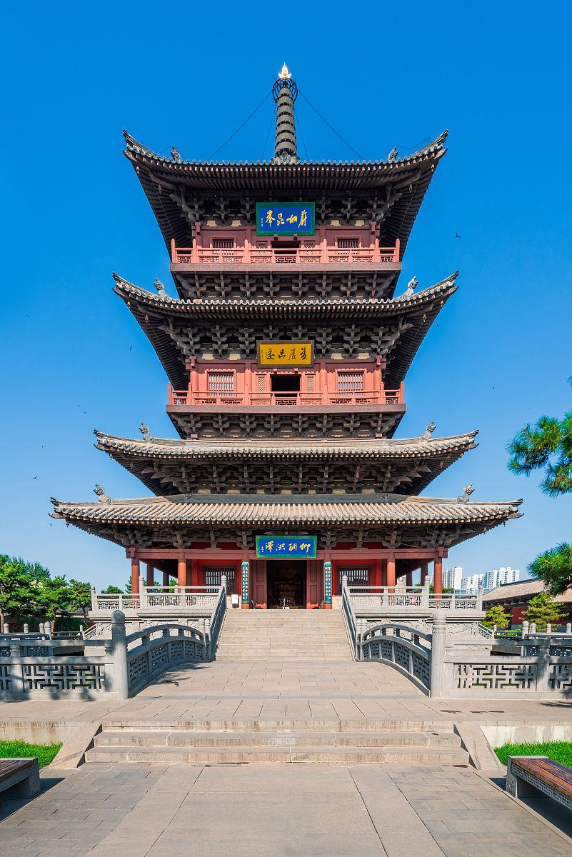 华严宝塔是继应县木塔之后,全国第二大纯木榫卵结构的方形木塔,塔身明三暗二共五层,通高43.5米,上景金盘,下承蓬池,是大同古城内的标志性建筑。