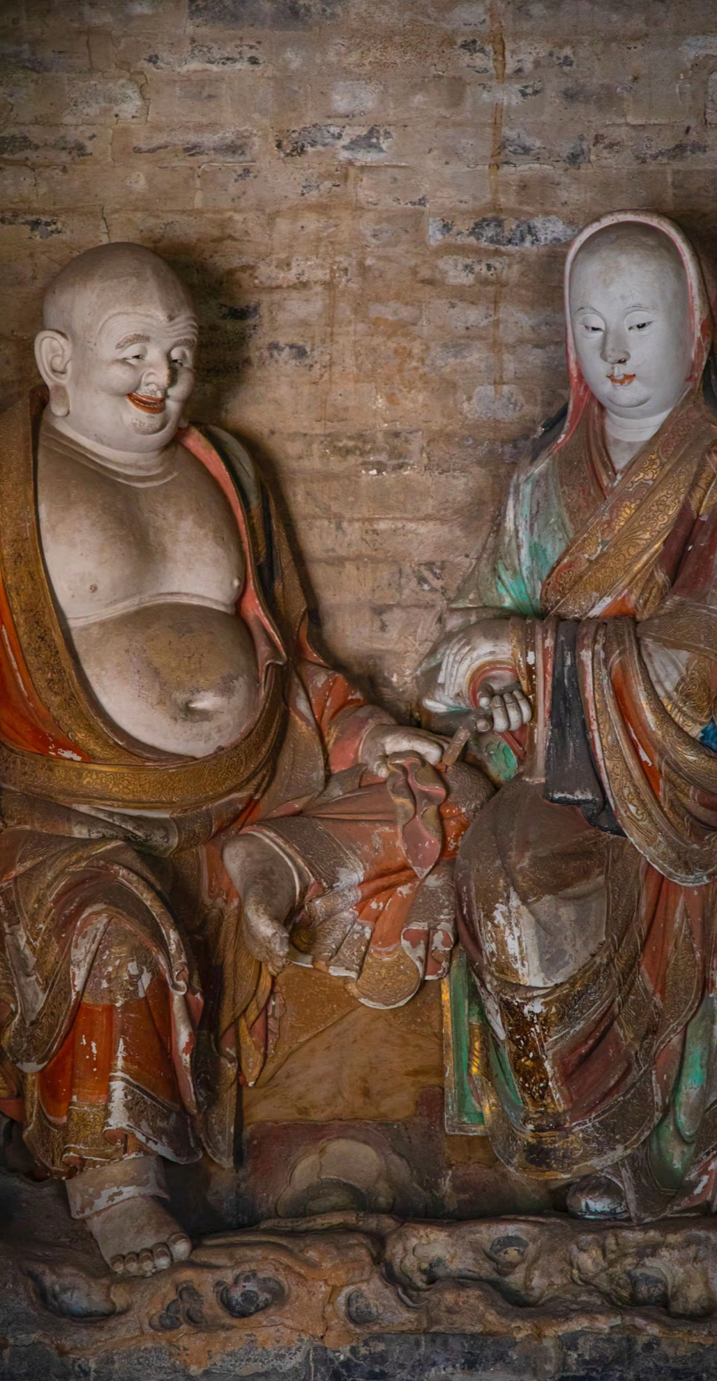 十八罗汉塑于北宋元丰二年(1079年),形态表情各异,或丰满,或清瘦,眉眼表情或夸张或内敛,生动传神,姿态或沉静或奔放,气质或雅或拙,各具品格。罗汉像细腻精致的纹饰里渗透着宋代雕塑艺术的经典装饰风格,为我国佛教文化发展史和雕塑史上难得的珍品。 在佛坛前沿砖雕束腰处,留有两方刻字,铭记着造像年代及布施者姓名,证实了塑像制作的确切年代。