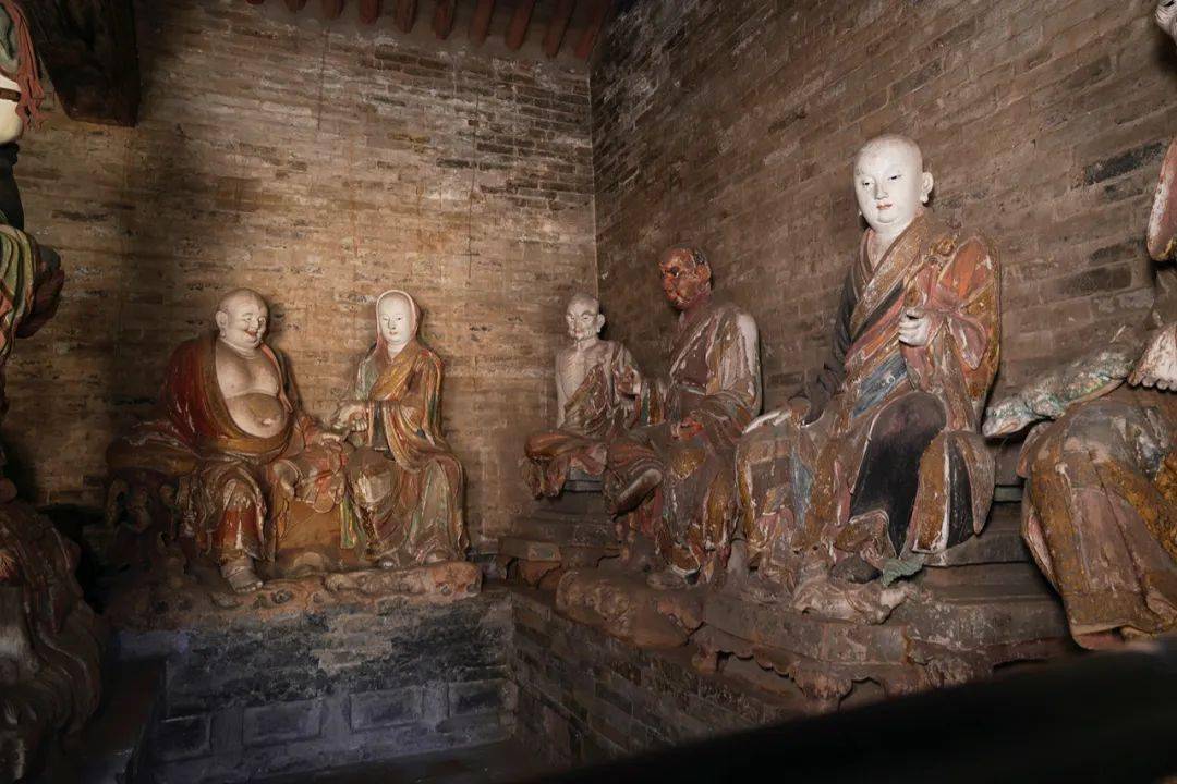 十八罗汉塑于北宋元丰二年(1079年),形态表情各异,或丰满,或清瘦,眉眼表情或夸张或内敛,生动传神,姿态或沉静或奔放,气质或雅或拙,各具品格。罗汉像细腻精致的纹饰里渗透着宋代雕塑艺术的经典装饰风格,为我国佛教文化发展史和雕塑史上难得的珍品。 在佛坛前沿砖雕束腰处,留有两方刻字,铭记着造像年代及布施者姓名,证实了塑像制作的确切年代。