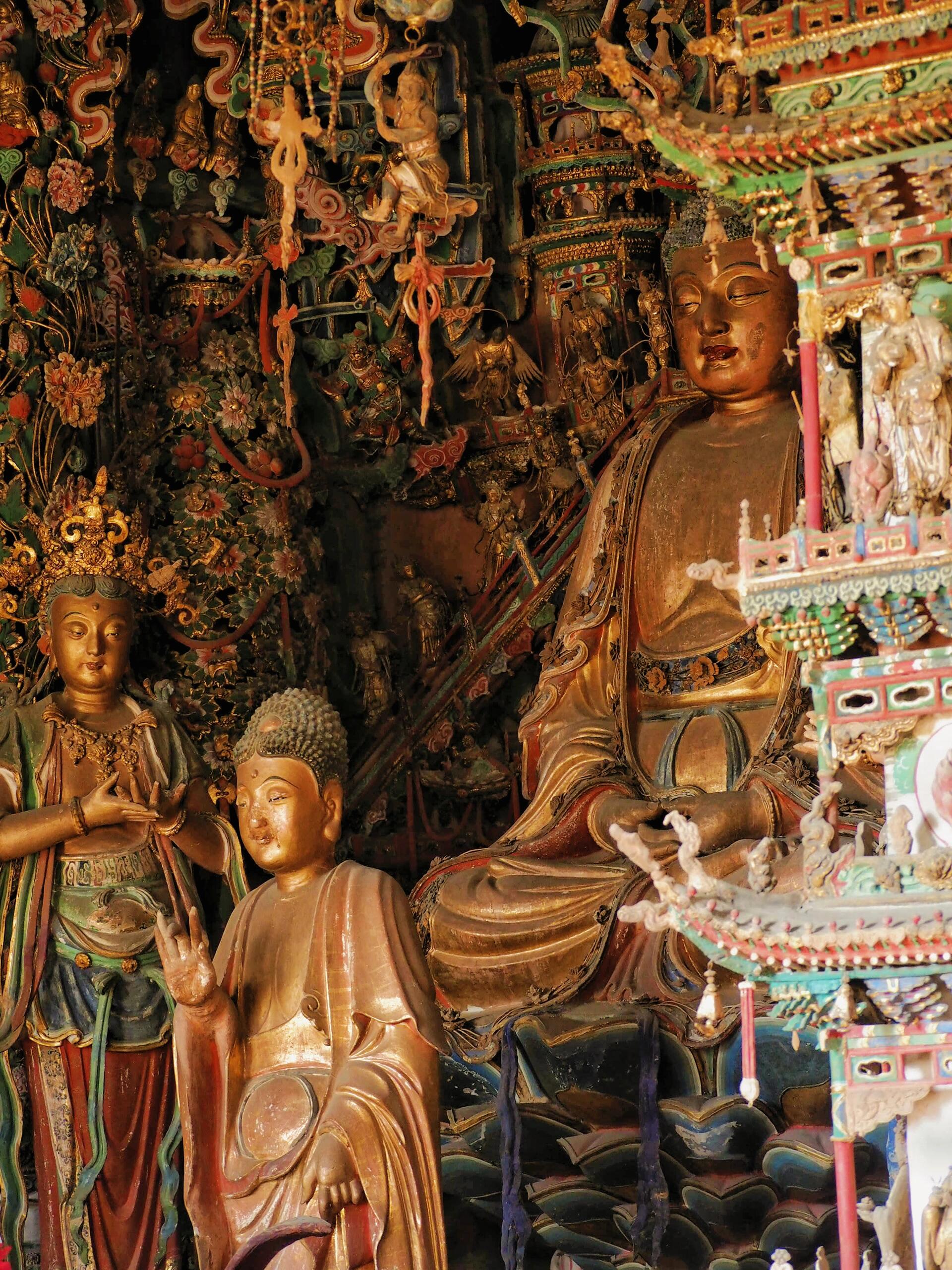 3⃣️悬塑:也称壁塑,属于浮雕一类。南壁、北壁和和佛龛上方的层楼叠阁、各种人物,都属于悬塑