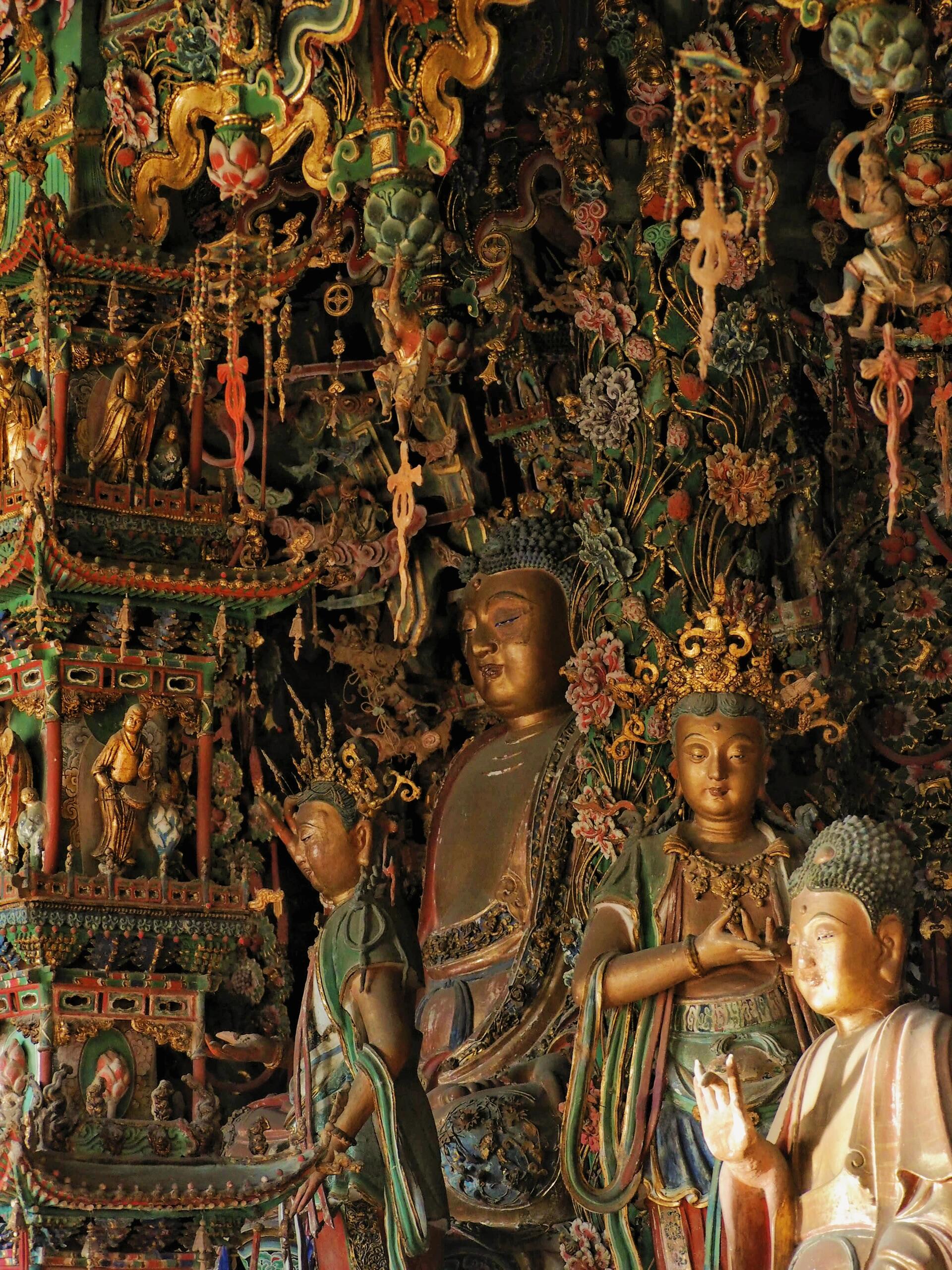 3⃣️悬塑:也称壁塑,属于浮雕一类。南壁、北壁和和佛龛上方的层楼叠阁、各种人物,都属于悬塑