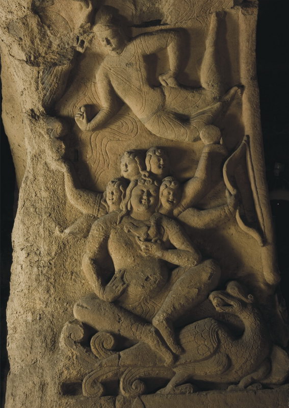 山西.大同.云冈石窟.第8窟.鸠摩罗天 第8窟门拱西侧骑孔雀的鸠摩罗天,五头六臂,颜若童子,左下手胸持斑鸠,具有浓郁的异域风情。多首多臂天神像造型来源于古印度,原为婆罗门教神祇。该组雕像为云冈石窟所独有,反映了早期佛教杂密兼容的特征。