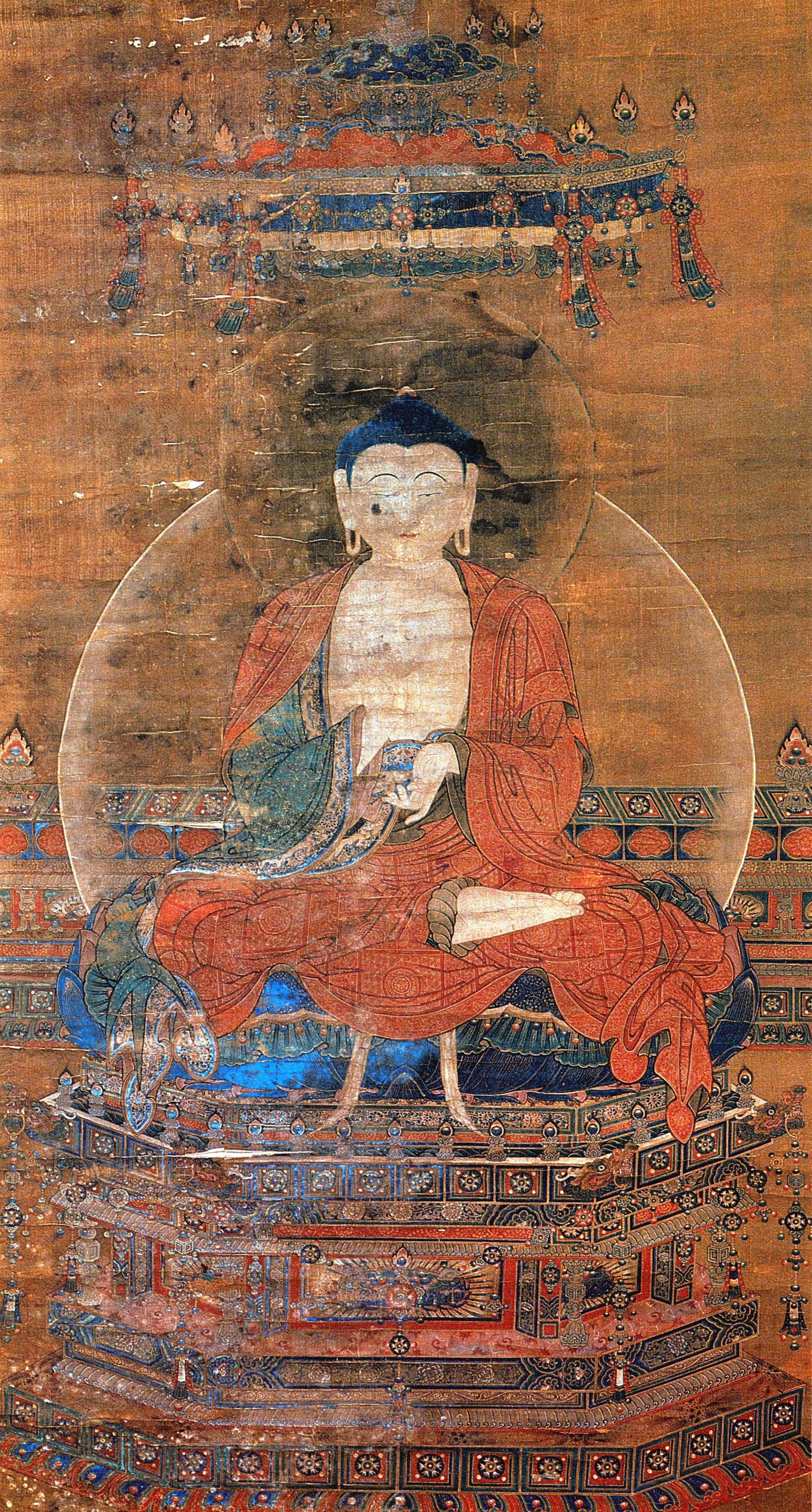 佛教绘画的创始人, 据传是三国时期著名画家曹弗兴, 其后许多著名画家多为寺院绘制各种宗教题材的壁画。 例如东晋著名的艺术大师顾恺之, 他不仅擅长人物、 山水,所画的宗教画也是画坛绝响。 有一个最脍炙人口的故事, 就是他为洛阳瓦棺寺所绘维摩诘像, 传说他尝闭门作画一月,画成后开户任人观赏 ,维摩诘的形像清癯高逸, “光照一寺”, 以至“施者填咽”, 倾刻间“便得钱百万”。 南朝刘宋时期的陆探微、南梁张僧繇均工道释人物。 北朝如北齐的曹仲达更吸收了印度笈多式的风格,所画人物佛像衣纹如薄纱被体, 透露出丰腴的肌肉感, 形成有名的“曹衣出水”式。 到了唐代, 著名艺术大师阎立本、 吴道子也莫不善绘道释。 吴道子为寺院所绘壁画达三百余壁,“皆绝妙一时”。 他所画的人物“天衣飞扬, 满壁风动”“虬发云鬓, 数尺飞动; 毛根出肉, 力健有余····巨壮诡怪, 肤脉连结, 过于僧繇矣。”( 《唐朝名画录》) 他所绘的宗教画, 构图奇变, 气魄奔放, 焦墨薄染, 为我国道释人物画奠定下坚实的基础。 但这些画家的主要作品多为壁画, 经过几度毁佛灭法,其真迹早已荡然无存, 作品的精神面目, 只能从后世的有关记载和摹本中得其仿佛。 降至五代、 两宋, 山水花鸟画盛行, 人物画退居于第二位, 而道释人物画渐不为画家所重。特别是南宋以后, 画家们更喜画山水, 对于道释人物画只是偶一为之。 因而大量的寺院壁画均由民间从事绘塑的专业画工来承担。 ·这些画工在画技方面, 代代相传, 上师古人; 同时与当代画家互相影响, 取长补短。 这种道释画,隋唐以前主要施于寺壁, 两宋以后则渐于绢素之上绘成通景(即?画),悬挂壁间。元明以来,又逐步形成单幅立轴,以便于保存、 携带。宋代的画可以说是水陆画的滥觞,作者都是隐名的民间画师。 日人大村西崖在其所著《中国美术史》中有一段论?画的话,他说:“此种绘画, 佛寺最多, 盛行于南宋。 然此类之画, 祇可挂于佛寺之壁, 为一种特别功德之物, 与普通玩赏绘画, 全无因缘, 善作者偏于所学, 几成专门技术,不列名于一般画苑,士大夫辄鄙为画匠之作, 尤不重之, 故中国画传中, 全无其名·····”。 这段话虽是指南宋?画而言, 但也适用于后来成套水陆画的作者。 正是这些为士大夫所鄙夷的画工,千百年来默默无闻地埋头创作, 用自己的智慧和辛勤的汗水为许多寺院绘制了无数形象生动、场面壮观的巨幅壁画和大量用于水陆道场的水陆画。 其中有不少保留至今, 但他们的姓名, 却多不为后世所知。