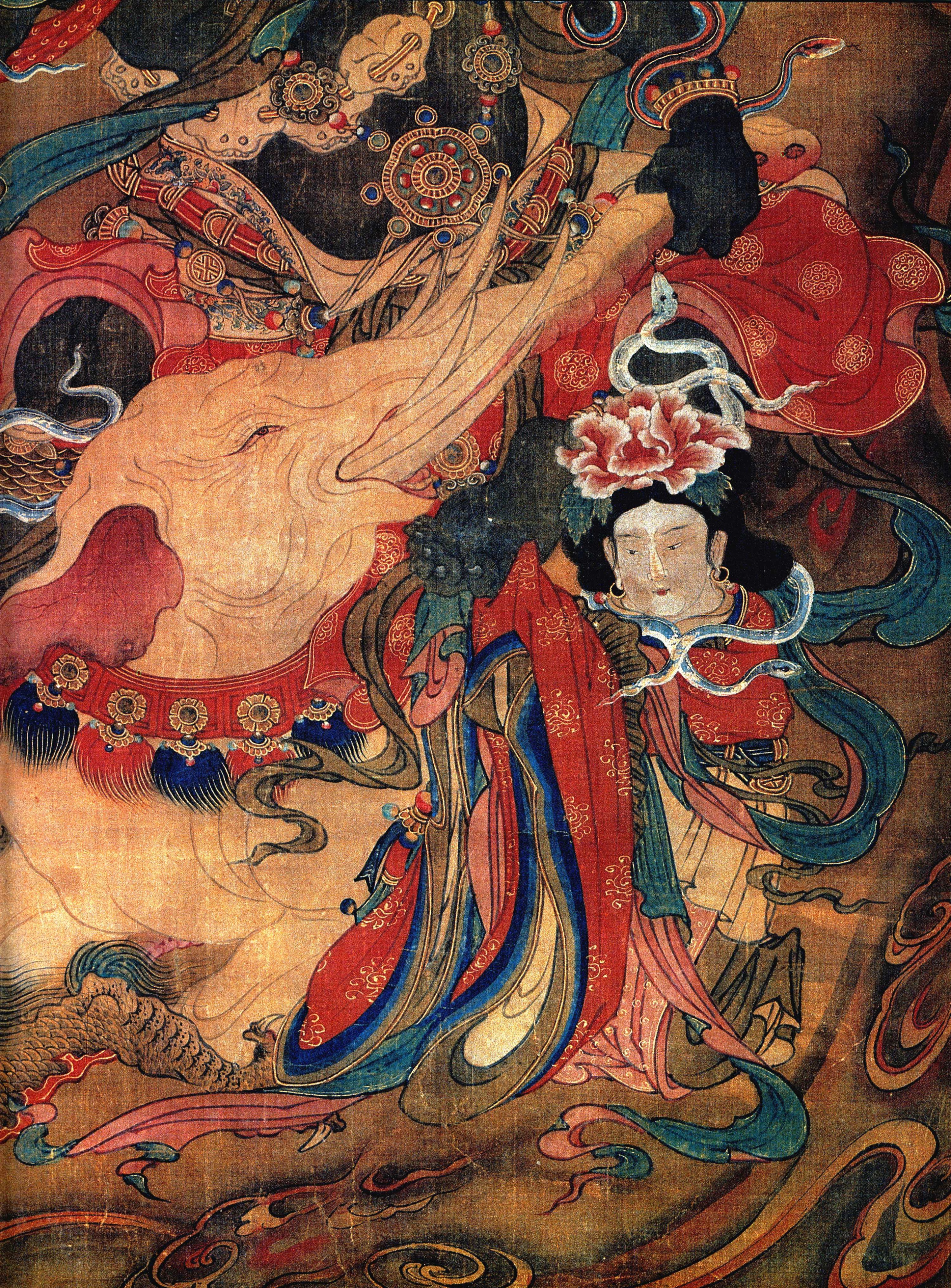 此画上端绘一跌坐菩藏。中绘步掷明王竖发怒目,现三头六臂相,下绘坐骑白象,足踏一女,女作惊恐状。左下方一龙伏地,一兽仰天,整幅画气势磅礴,笔力遒劲。