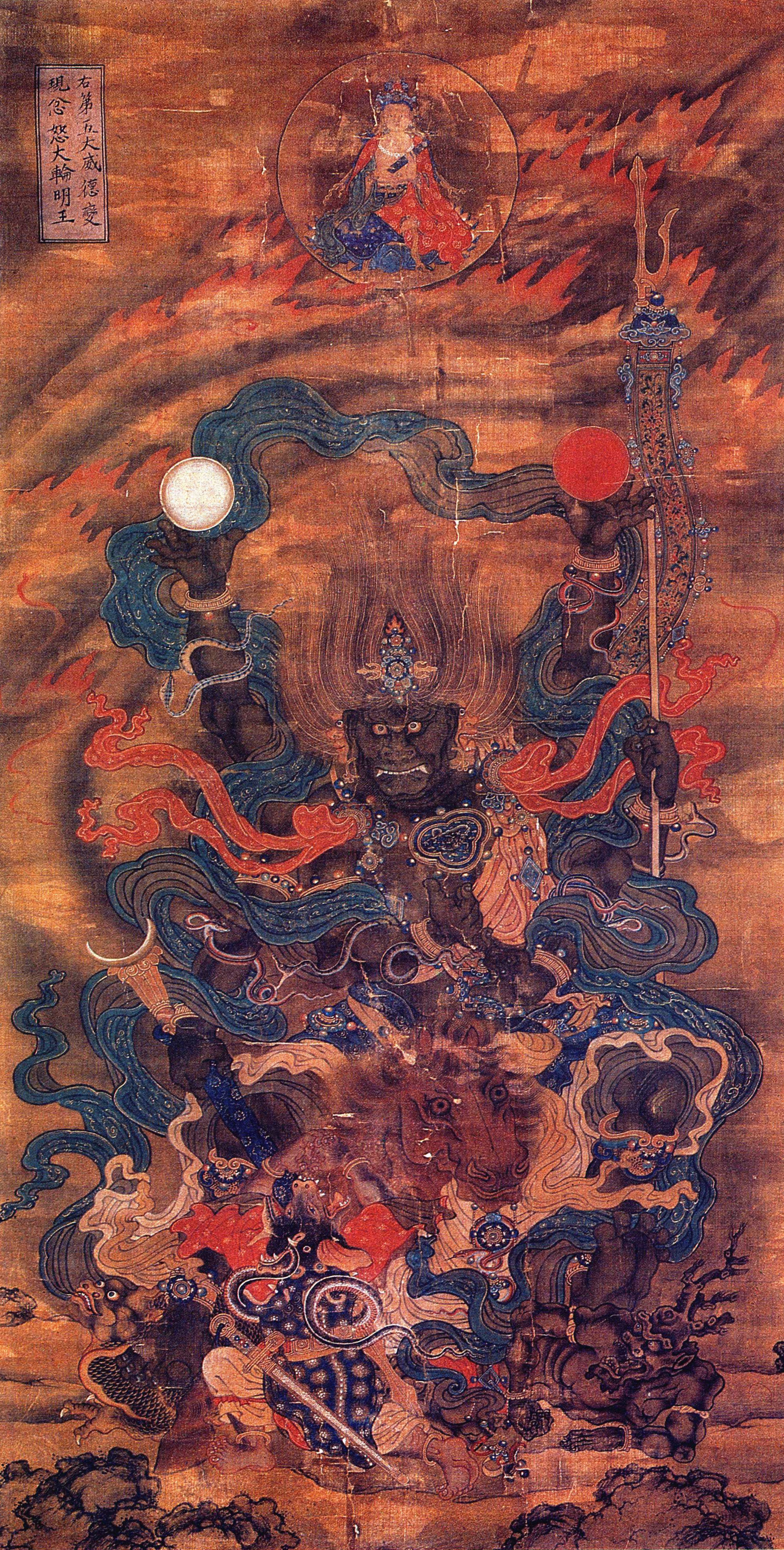 此画上端绘一跌坐菩萨。明王青面獠牙,竖发怒目,现三头六臂相,上身赤裸,飘带缭绕。上右手举月,上左手举日,骑一大马,座下左右两龙伏卧,中有一怪物举首仰望。