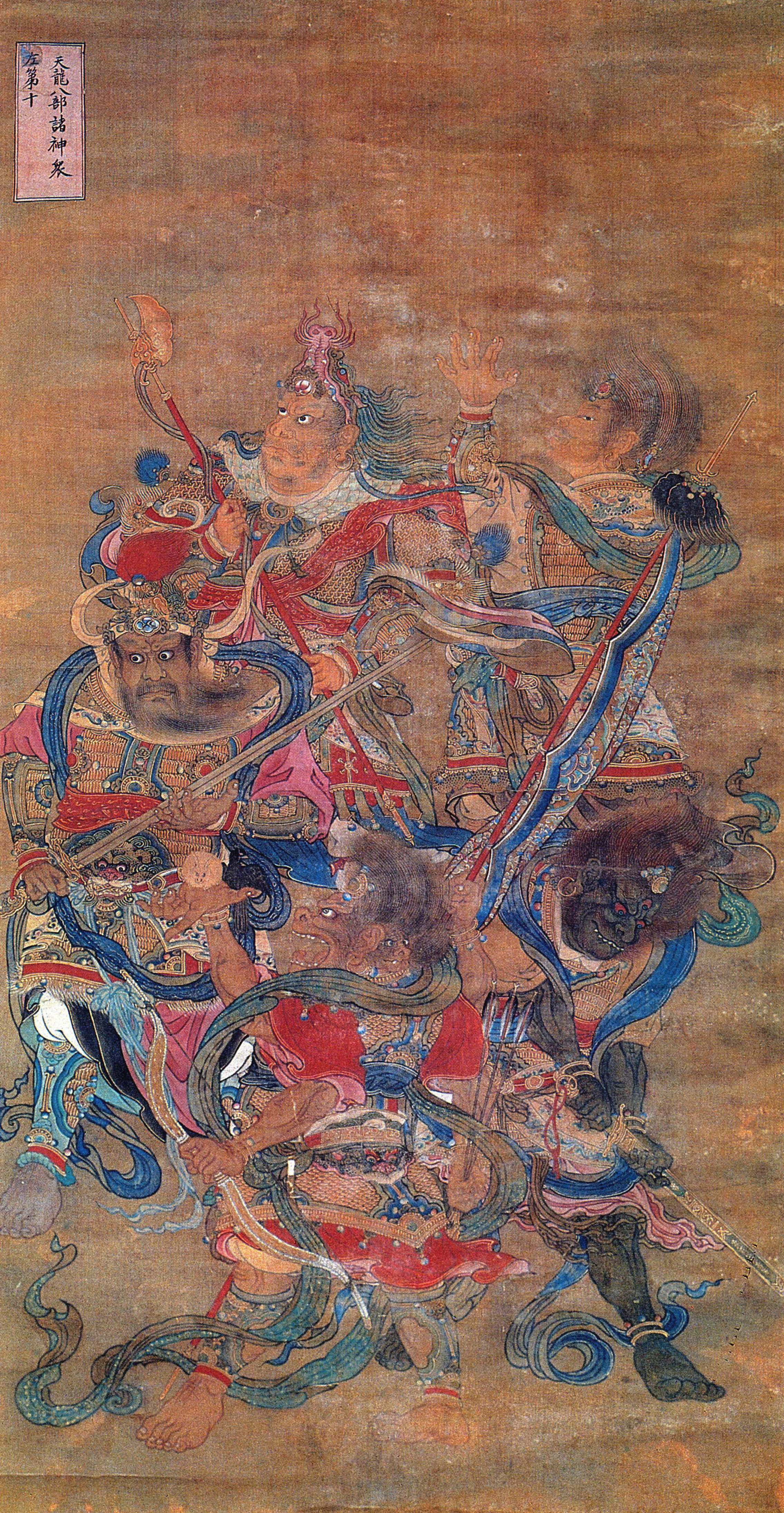 五)阿修罗、 (六)迦楼罗 (金翅鸟)、 (七)紧那罗 (歌神)、 (八)摩 喉罗迦 (大蟒神)。 此画虽名天龙八部, 实际只画五员, 俱作