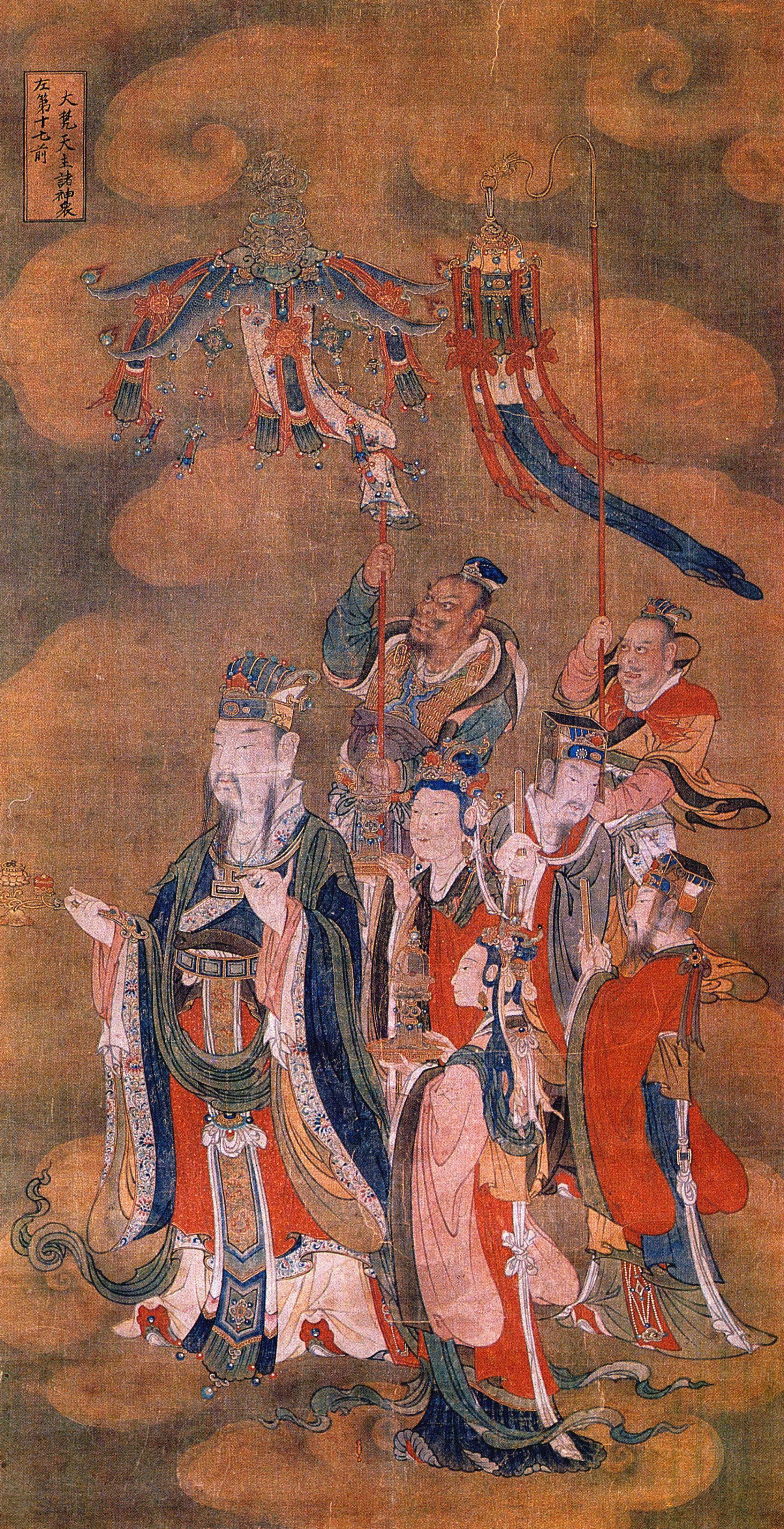 左方一王者形象为大梵天主,头戴五梁冠,白面长须,宽袍广袖,右手执薰炉,立于云端。两人手捧珍宝侍立于后。两