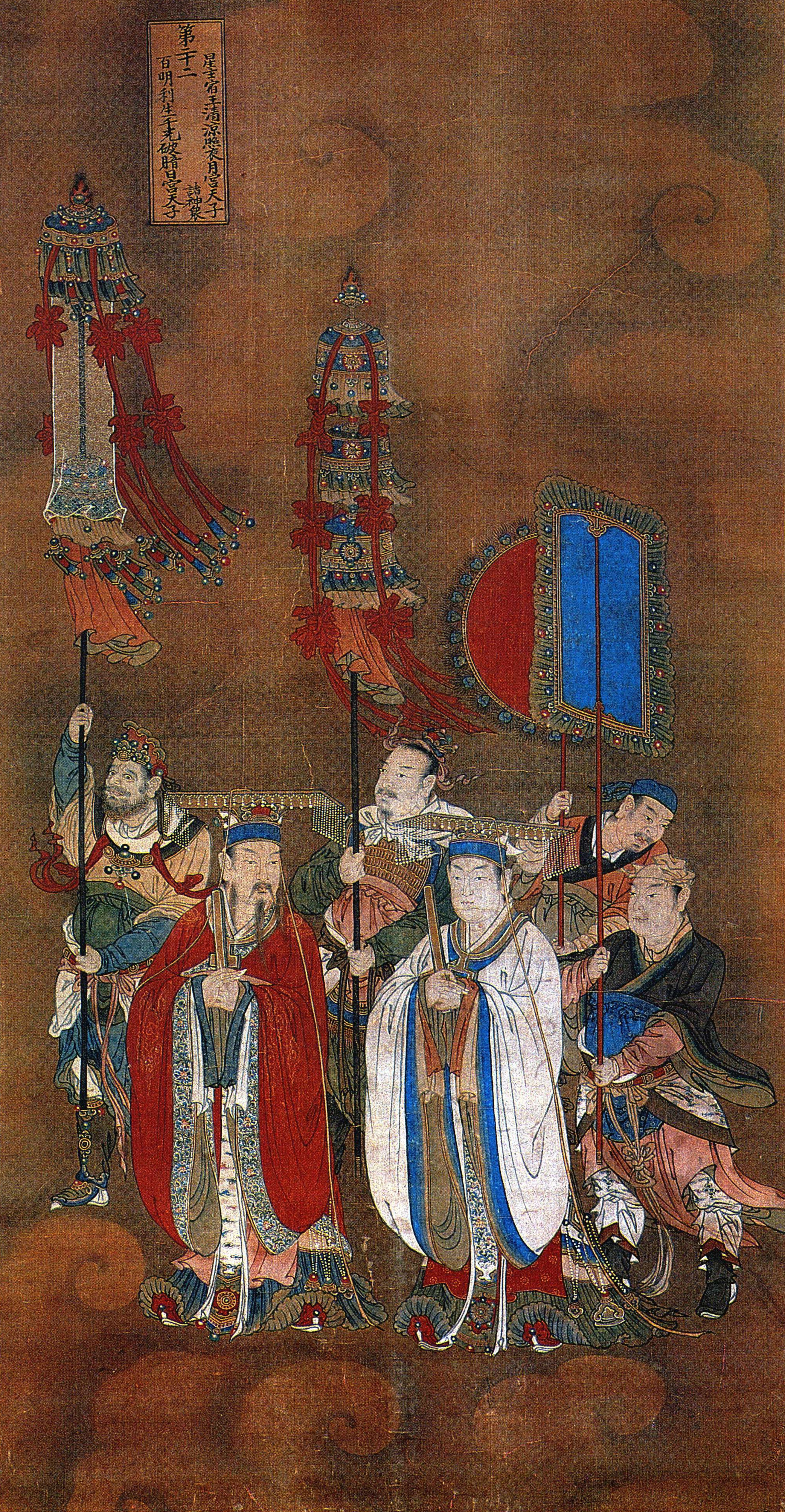 画中头戴冕旒双手捧圭的两位王者,即月宫天子和日宫天子。 月宫天子主管从夜到晨清凉照夜之事; 日宫天子主管日间照明利于百物生长之事。后随侍从四人,手持幡幢伞扇,动作不同,情神各异,显示出谨守岗位各司其职之意。