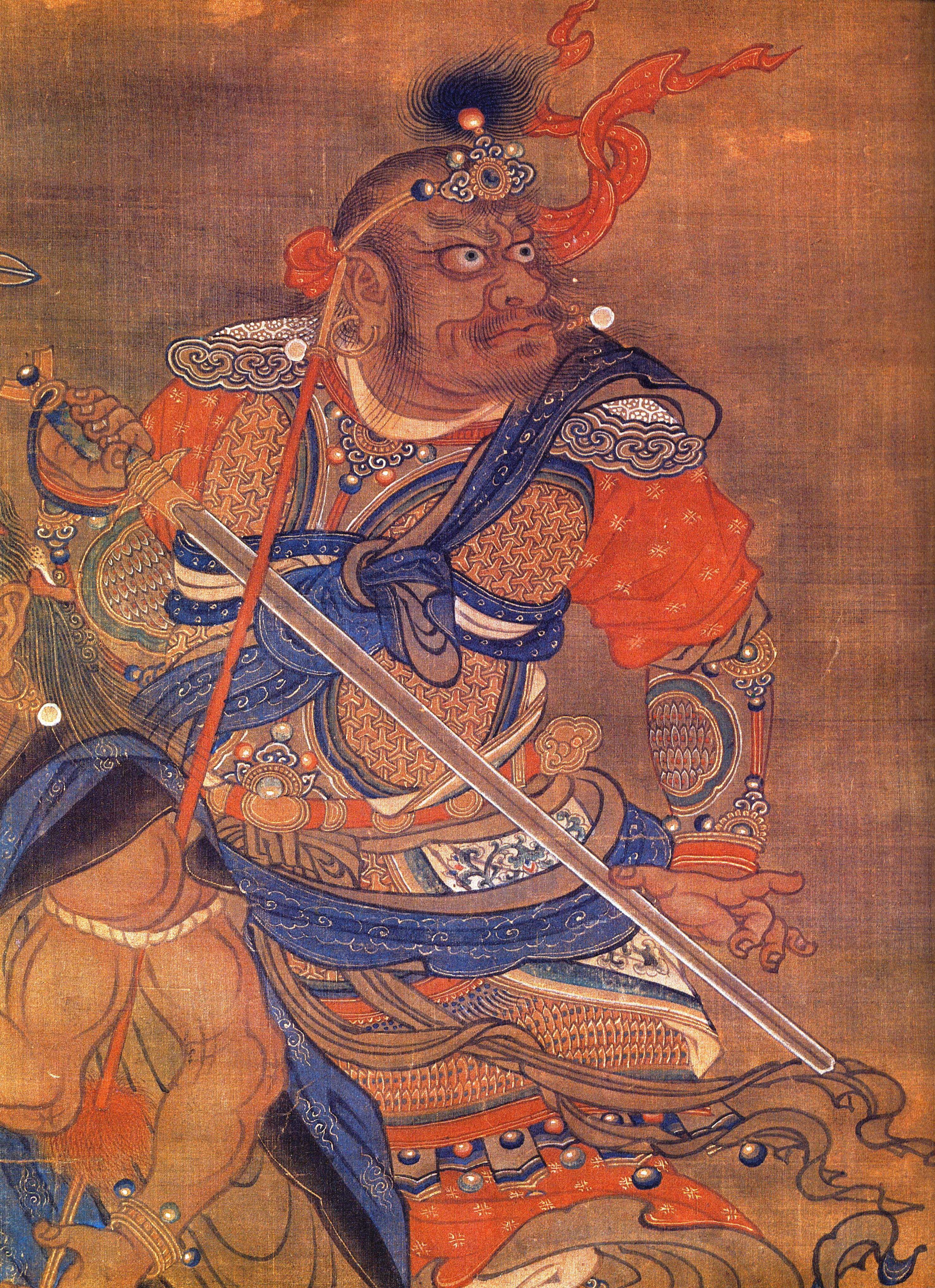 太阴即月神。罗睺、计都为二星名,逆日月而行。紫气、月孛也为二星名,顺日月而行。下层三神,左方一将为太阴,中间老将为罗睺,右方执剑一将为计都。此三神将画得威武雄壮,颇具个性。上层四神为紫气、月孛及其它星君。