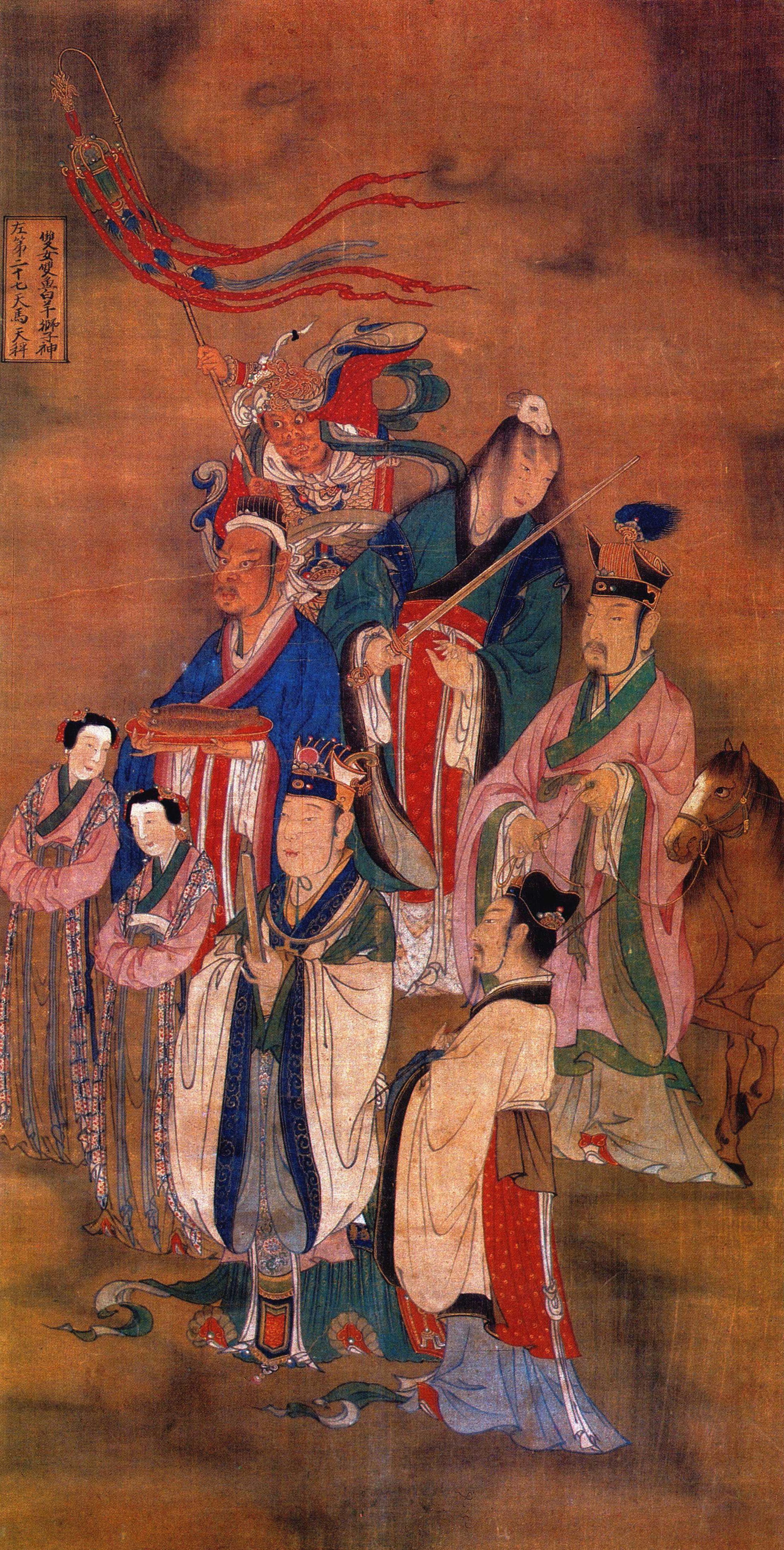 其次为人物画, 作者根据各种不同人物的身份予以刻划, 对男女老少、正邪美丑, 均能表现得恰如其分。 如帝王、 后妃都画得面容丰腴, 体态端庄, 服饰华丽, 色彩秾艳, 表情矜持; 武臣将士则着重表现其勇猛威武的神情; 画僧、 尼、 道、 冠则外表虔诚, 内心恬淡, 缁衣道 貌, 落拓不群; 儒者、 贤士和 文人画家, 各具情态, 儒者或着各色官服, 或穿便装, 褒衣博带, 负琴背剑, 仪态雍容。 内中一画家, 手持画像一幅, 正与人把臂攀谈, 表情生动。 九流百家, 包罗尤广, 上画士农工商、 医卜星相。 士负剑; 农荷锄担食; 工为木工, 背负工具; 商为挑担小贩; 医人、 卜者均有明显的职业标记, 一望可知。 下为戏剧、 百戏演员。 戏剧人物包括生旦净丑末, 生着圆领长袍, 翘翅幞头, 手执书卷; 旦着小袖上衣、 短裙, 下露纤足; 净上身裸体文身; 丑短须浓眉, 头戴短舒翅幞头, 身着长袍; 末则长须裹巾, 身穿补缀长衫。 百戏人物, 装束奇特, 或穿外氅, 或披狮形外衣, 或背长鼓。 一壮士头裹巾, 上身赤膊, 下着短裤; 手持三环,旁立一侏儒, 双手抱一小口高体瓶; 中一人身穿圆领皂袍, 手中握笔,正在与人交谈, 似为班主。 这幅画,人物种类繁多, 对研究中国古代社会风俗、社会经济状况、 服饰、 戏剧等都有重要的参考价值。