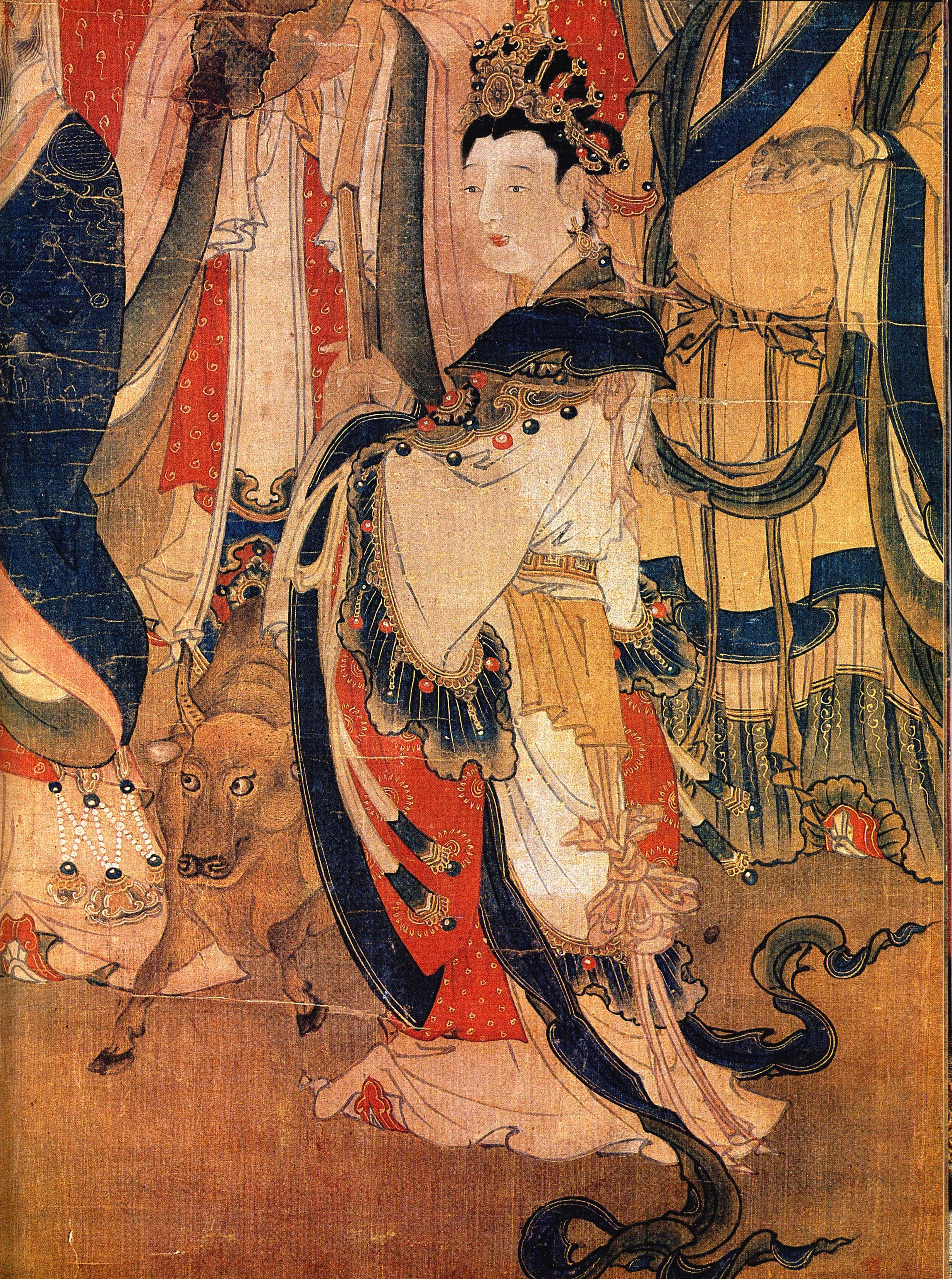 画中诸天多作女性形象,如第48一49 幅大梵天,共画十位天人,长者端庄, 曲眉丰颊, 雍容自若; 少者淑媚, 婀娜多姿。 各人的装束也极华丽, 有的头戴宝冠, 身缀璎珞, 肩披披帛, 祖露胸臂。 有的靓装艳服,长裙广袖, 衣带飘举。 人物虽多, 但由远至近, 排列有序, 繁而不乱, 恰似从九天云霄中冉冉降临 。