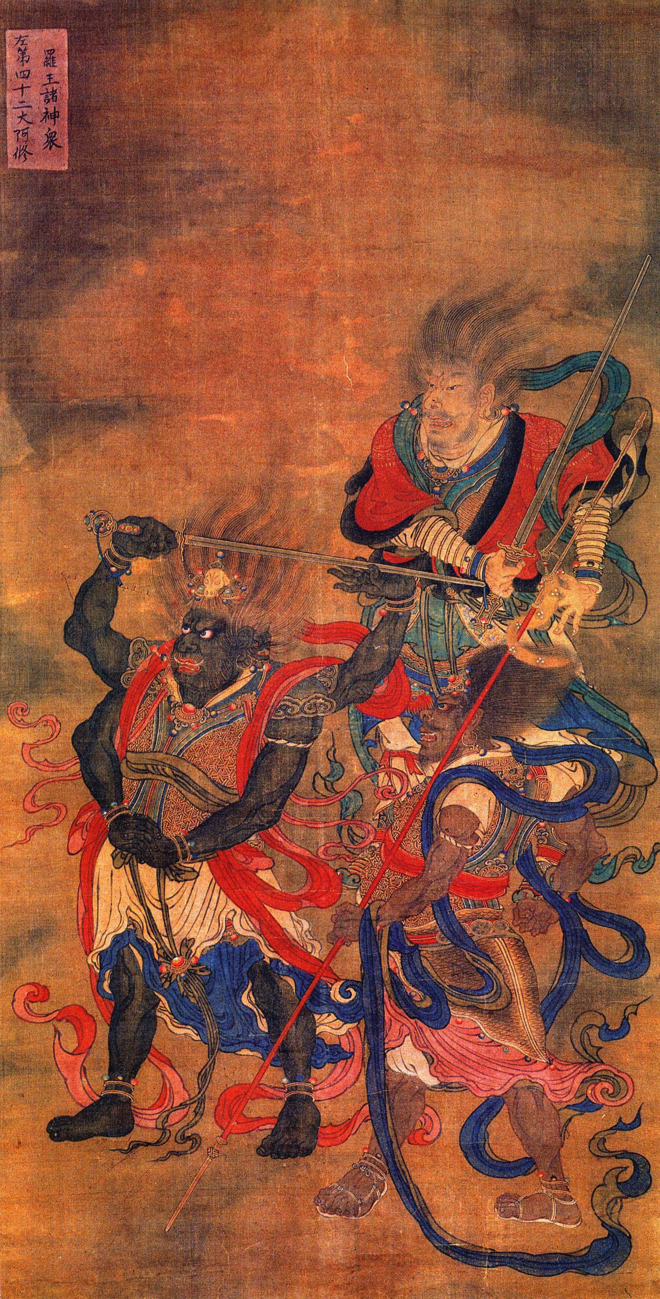 阿修罗为梵语音译, 意为无端, 为天龙八部之一。 形状极大,多力好战。 画中三位阿修罗俱竖发怒目裸臂跣足,起舞的飘带更增添了杀气腾腾的气氛。