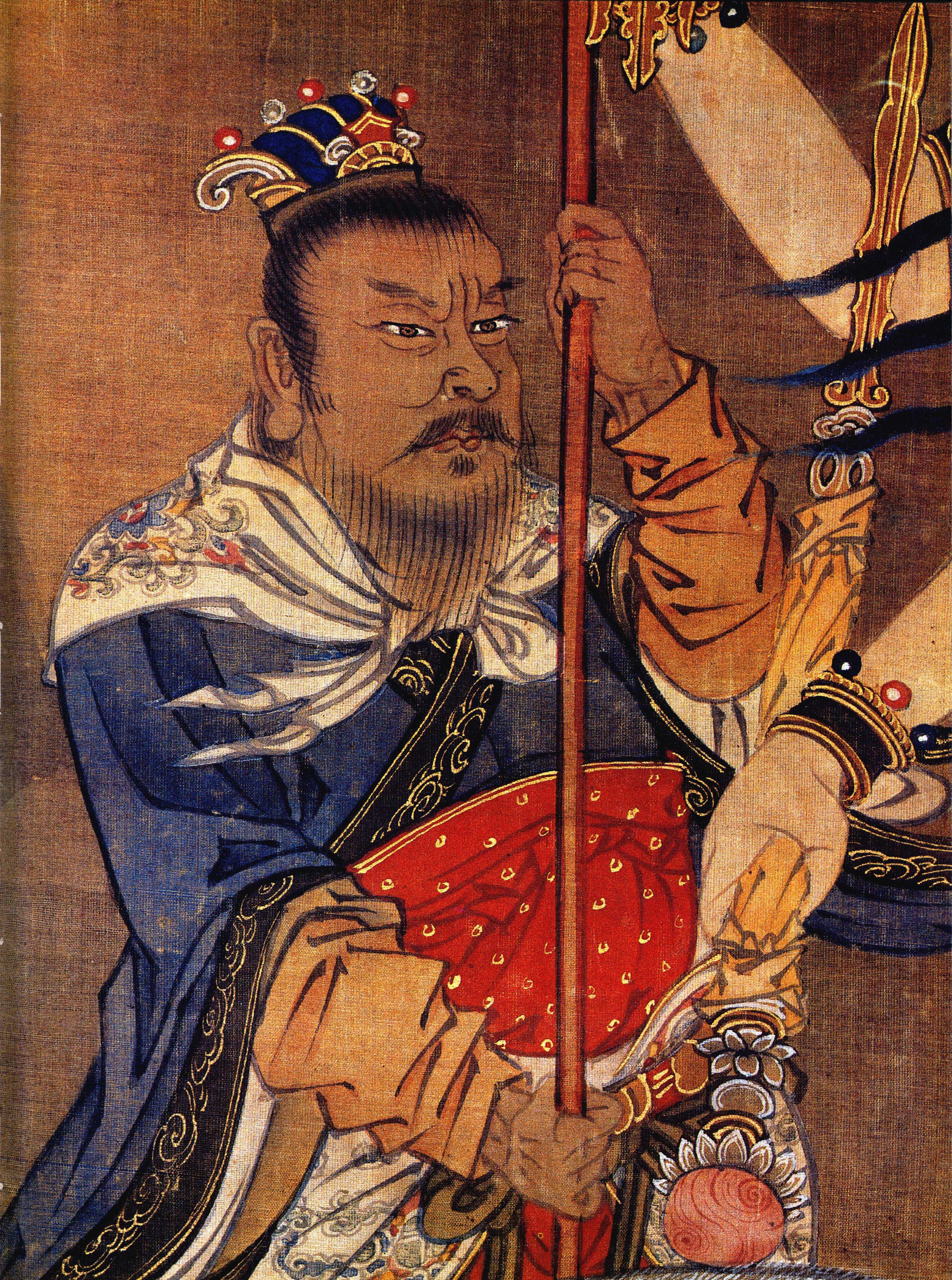 以上郑、 唐两序均称此画为“救赐镇边水陆画 ”。 明代和北方鞑靼、 瓦刺时有纠纷, 在大同、 宣化一带兵戈不绝。 正统十四年 ( 1449 年) 土木之变, 英宗被掳北去, 京师被围, 明廷震动。 右玉为明代西北边防重地, 宝宁寺正建于天顺四年(1460 年)。 这一年鞑靼又大举进攻, 兵锋直至大同右卫。 因此这堂画很可能是天顺年间敕赐给宝宁寺, 用 以“镇边”的。 成画的时间估计也应在这一时期。 从画风上看, 这堂水陆画的人物多是丰颊厚颐, 大部服装为明代制度, 偶有元人衣履, 绝无清朝装束。 服饰衣纹繁复, 装饰华丽, 设色用大红大绿, 具有明代人物画的风格和特点。 画中白线均用蛤粉描绘,故至今明亮如新, 绝不似清人用铅粉作画, 经久便黯然失色者可比。 又山西省太原市崇善寺所藏明弘治间佛本行传画册、 善财童子画册等的风格也与此画极相类似。 因此种种, 把这堂水陆画定为明代作品, 是比较确当的。