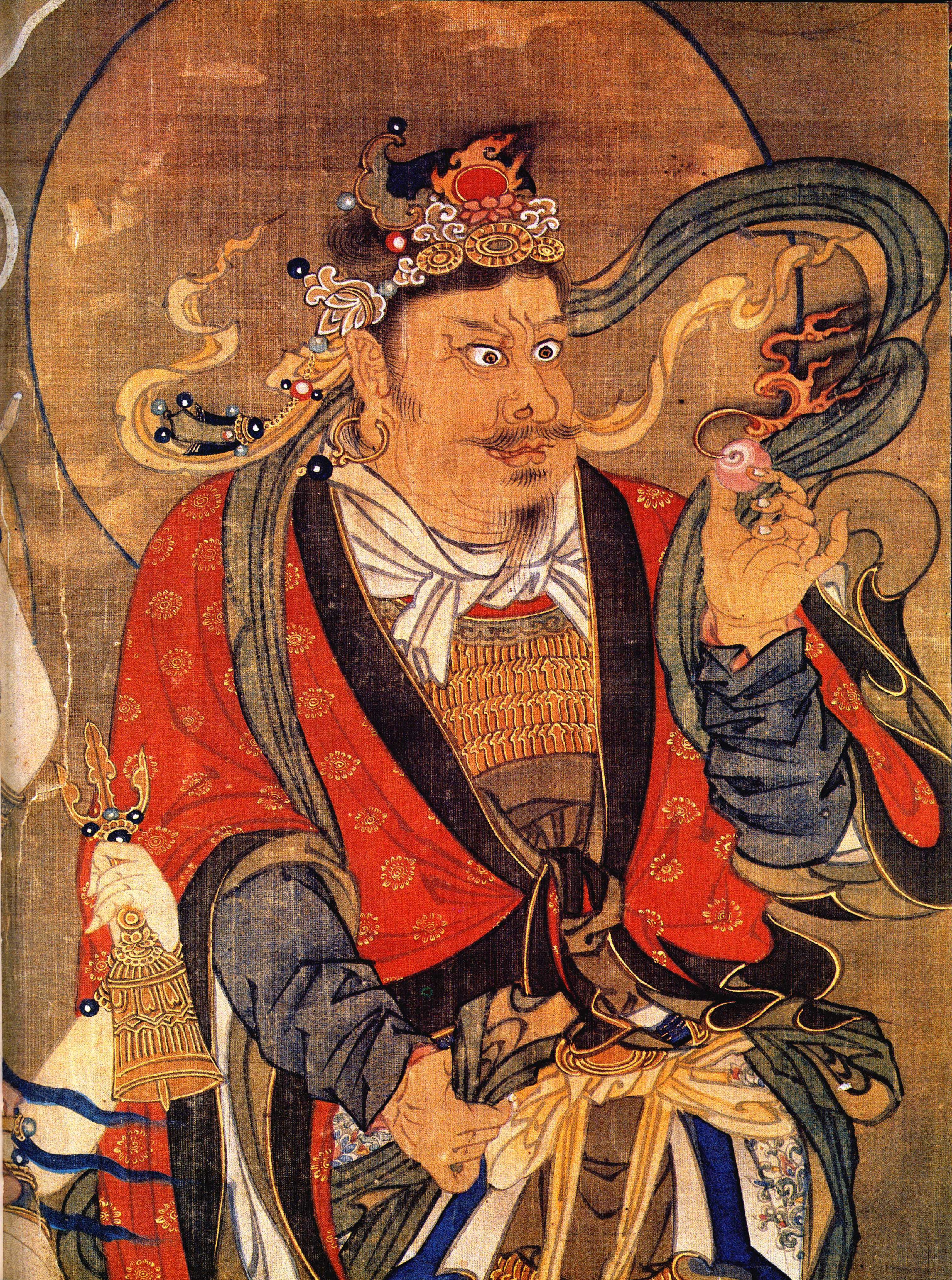 摩醯首罗居色界之顶,为大千世界之主。三头六臂,胜鬘凤钗,袒胸裸臂,胸垂璎珞,金环约腕,俨然为唐代美女形象。一男子执幡侍侧。右方一中年男子,手持宝珠,为随求天子。