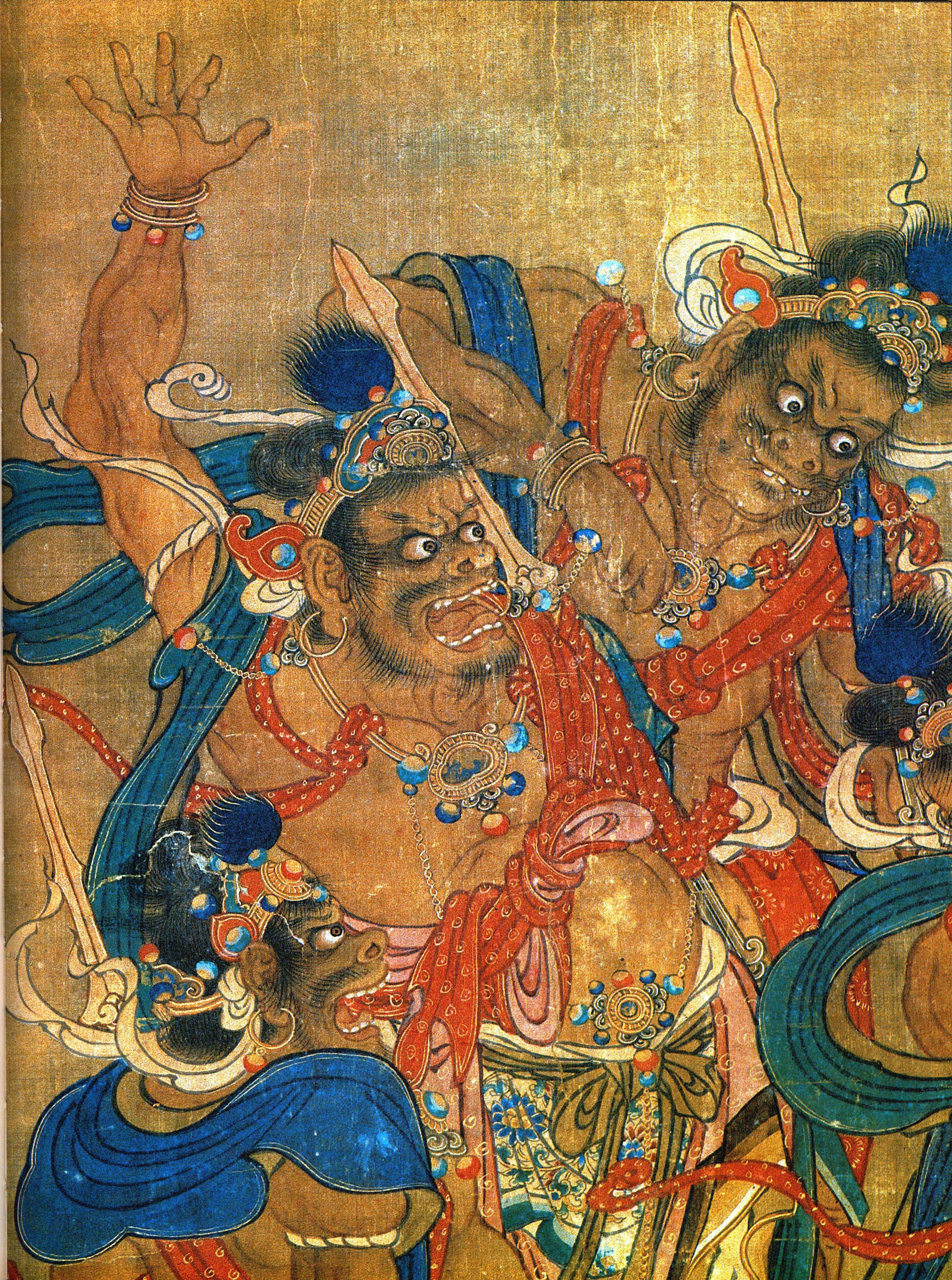 金刚密迹为手执金刚杵现大威势拥护佛法诸天神的通称。画中四位金刚大都束发怒目,满面杀气,或手执兵器,或摩拳擦掌,作愤怒状。通幅画所绘人物衣带飘动流畅,有唐代大画家吴道子“吴带当风”之遗意。