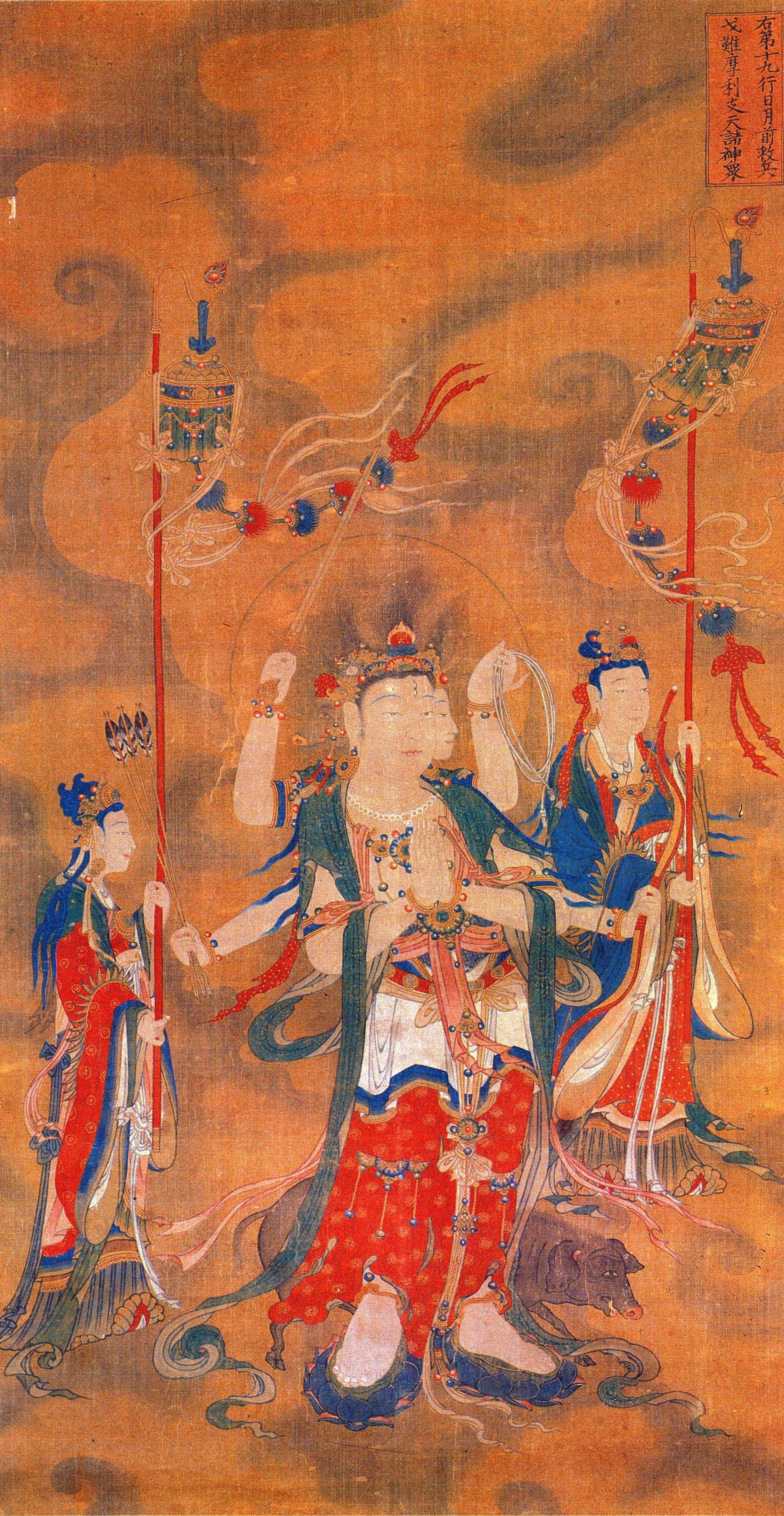 摩利支天又名摩利支菩萨。 她是在太阳出来之前, 具有神力的天神。相传有急难时,特别是遇到兵戈之灾,若念她的号名,就能脱离灾难。 画中摩利支天系双头六臂之女神, 右边一手握剑, 一手握箭。 左边一手执索, 一手执弓。 中间二手合十, 立于青莲之上。 身后一猪, 待考。 左右有两侍女执幡而立。