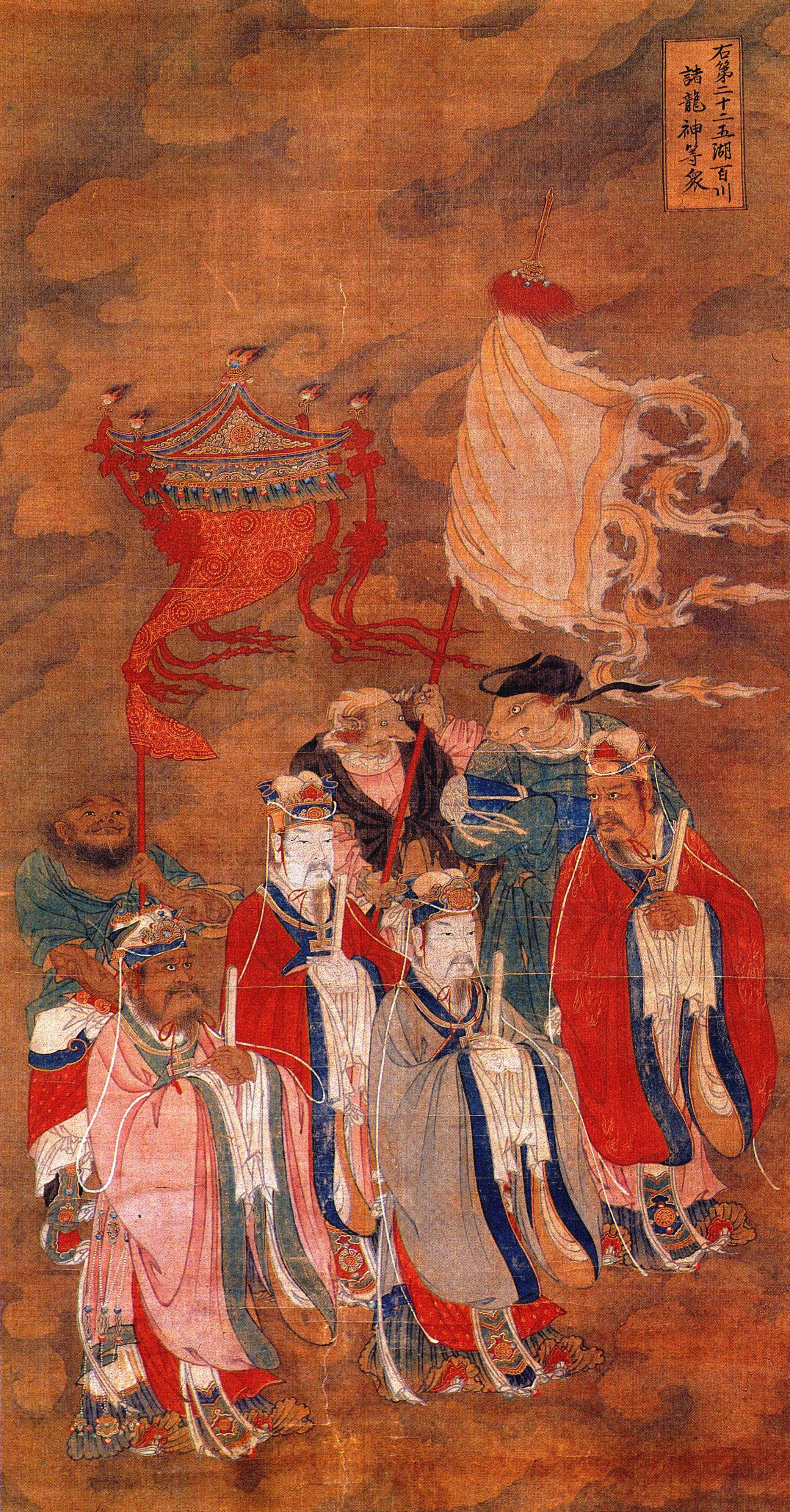五湖百川系泛指重要湖泊江河而言, 并非指具体湖泊。 画中画四位龙神, 龙神后有两兽面人物。 另一多须者仰面举盖,旌旗幡盖飘舞于云雾之中, 颇饶意味。