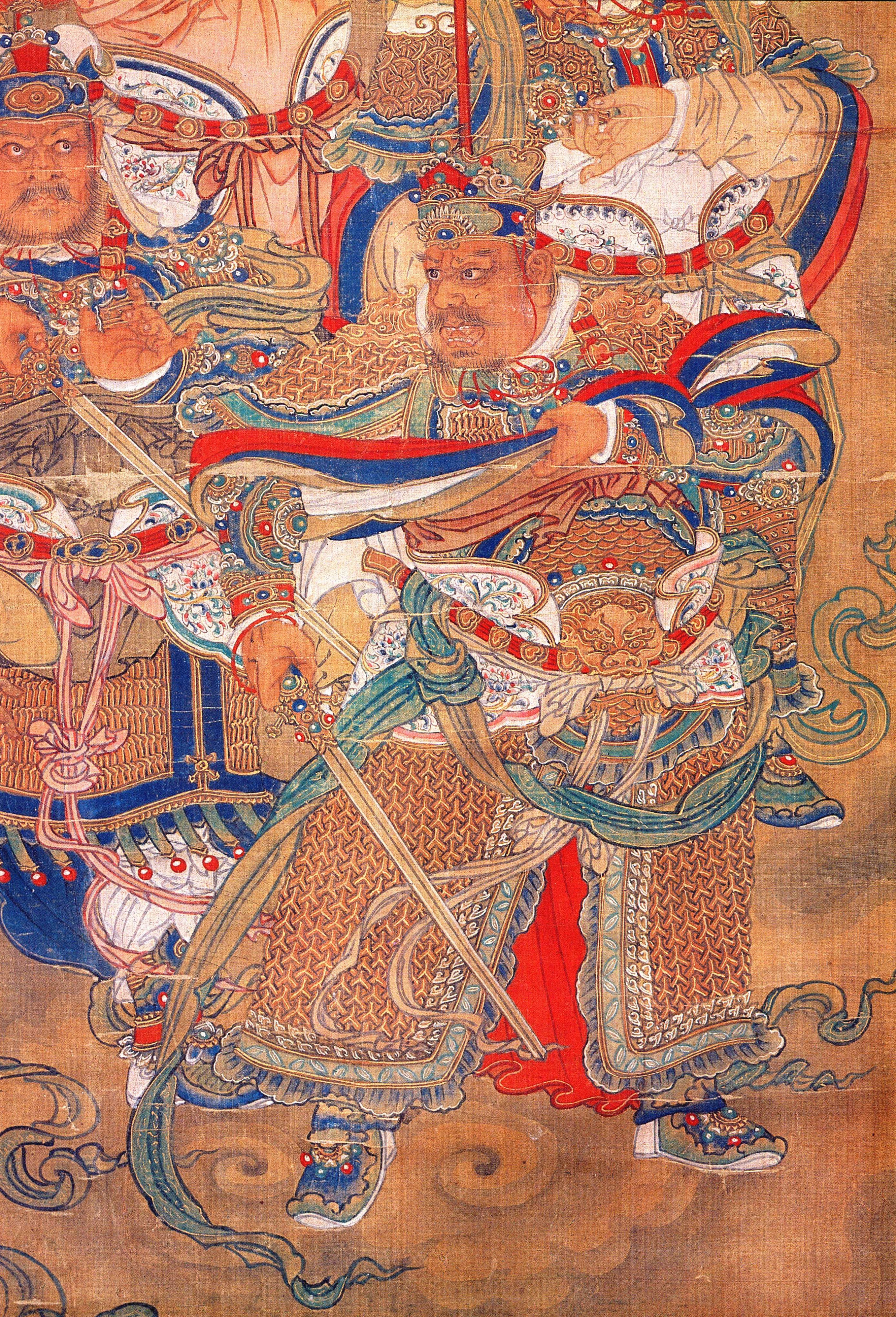 以上郑、 唐两序均称此画为“救赐镇边水陆画 ”。 明代和北方鞑靼、 瓦刺时有纠纷, 在大同、 宣化一带兵戈不绝。 正统十四年 ( 1449 年) 土木之变, 英宗被掳北去, 京师被围, 明廷震动。 右玉为明代西北边防重地, 宝宁寺正建于天顺四年(1460 年)。 这一年鞑靼又大举进攻, 兵锋直至大同右卫。 因此这堂画很可能是天顺年间敕赐给宝宁寺, 用 以“镇边”的。 成画的时间估计也应在这一时期。 从画风上看, 这堂水陆画的人物多是丰颊厚颐, 大部服装为明代制度, 偶有元人衣履, 绝无清朝装束。 服饰衣纹繁复, 装饰华丽, 设色用大红大绿, 具有明代人物画的风格和特点。 画中白线均用蛤粉描绘,故至今明亮如新, 绝不似清人用铅粉作画, 经久便黯然失色者可比。 又山西省太原市崇善寺所藏明弘治间佛本行传画册、 善财童子画册等的风格也与此画极相类似。 因此种种, 把这堂水陆画定为明代作品, 是比较确当的。