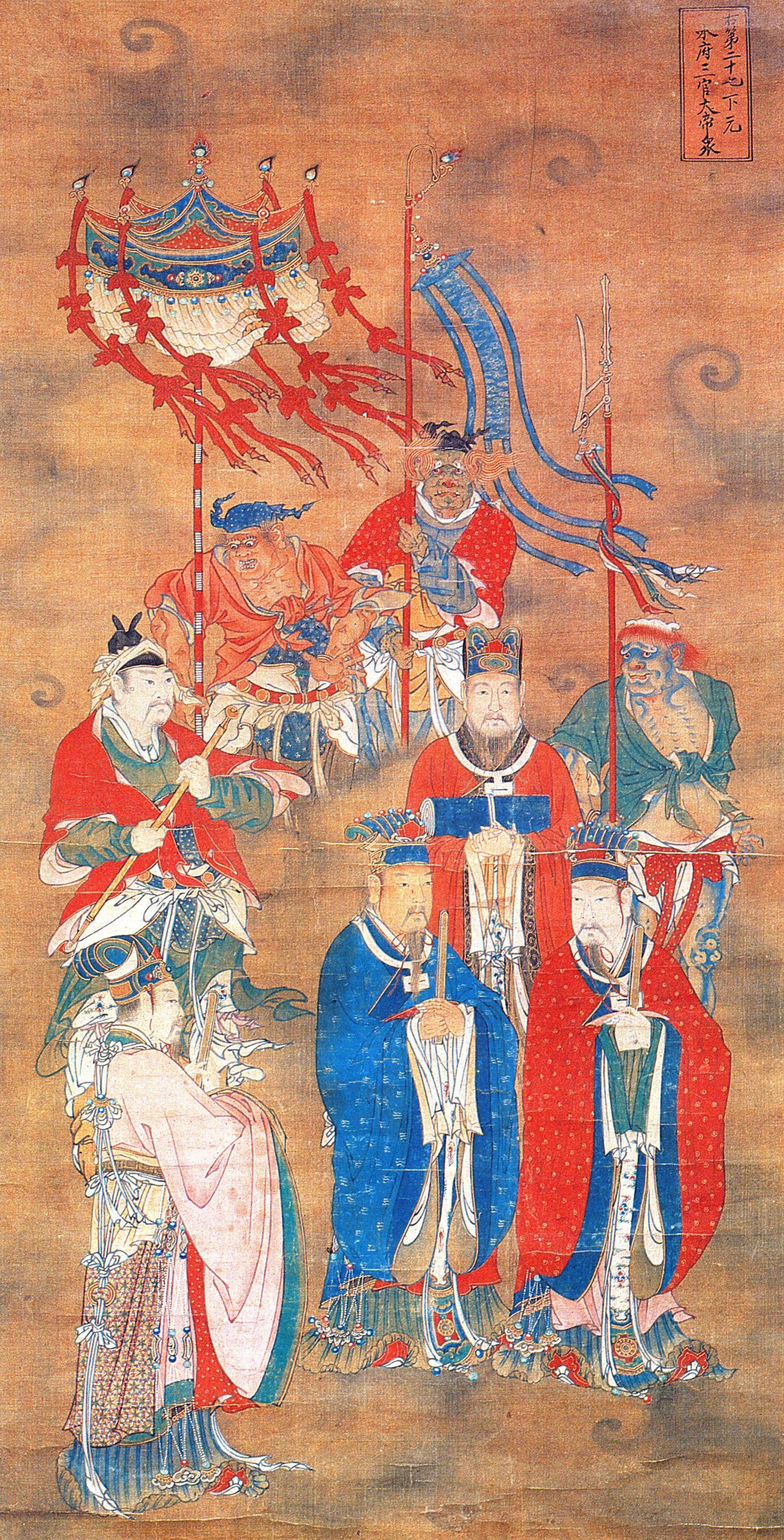 三官大帝 系道教供奉之神, 详见第 77 幅画说明。 画中下方三位戴五梁冠执圭者为三官 大帝, 其余五人为侍从。