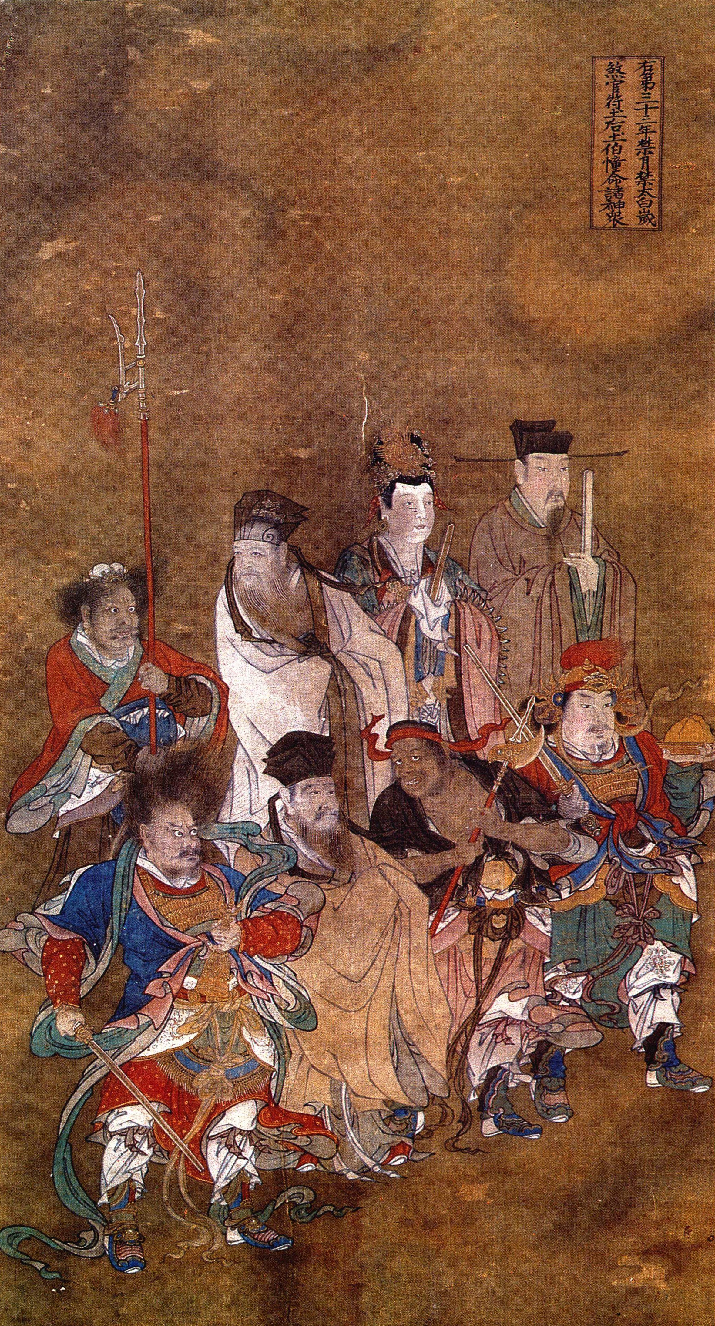 年禁、 月禁为年、 月禁忌之神; 太白即金星, 金有肃杀之意; 岁煞为最凶恶之神; 官符即官煞; 土后、 土伯即土地神;幢命为幡幢之神。 画中人物前后两排, 前排右起为年禁、 月禁、 太白、 岁煞。 后排右起为: 官符、 土后、 土伯、 幢命。 此画构图虽较单调, 但是人物的衣冠颇具特色, 神态十分生动。 尤以左下方的岁煞神怒目竖发, 威武雄壮, 刻划得很有力量。