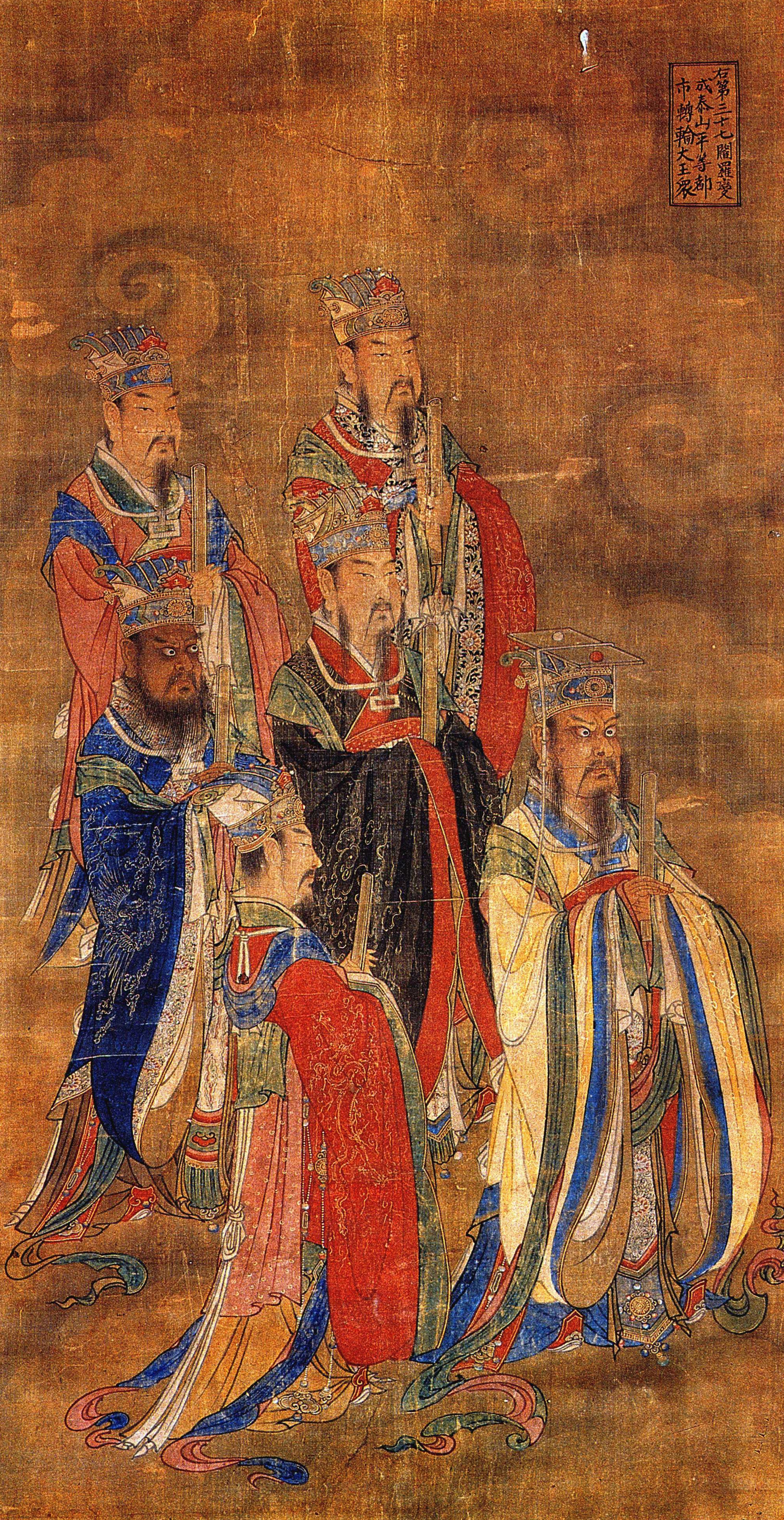 阎罗、 变成、 泰山、 平等、 都市、 转轮都是阎王名, 与第135 一137 幅图中四阎王合称十殿阎王。 此画构图虽然呆板,但人物服饰各不相同, 特别是花纹图案十分讲究, 可供研究古代服饰的参考。