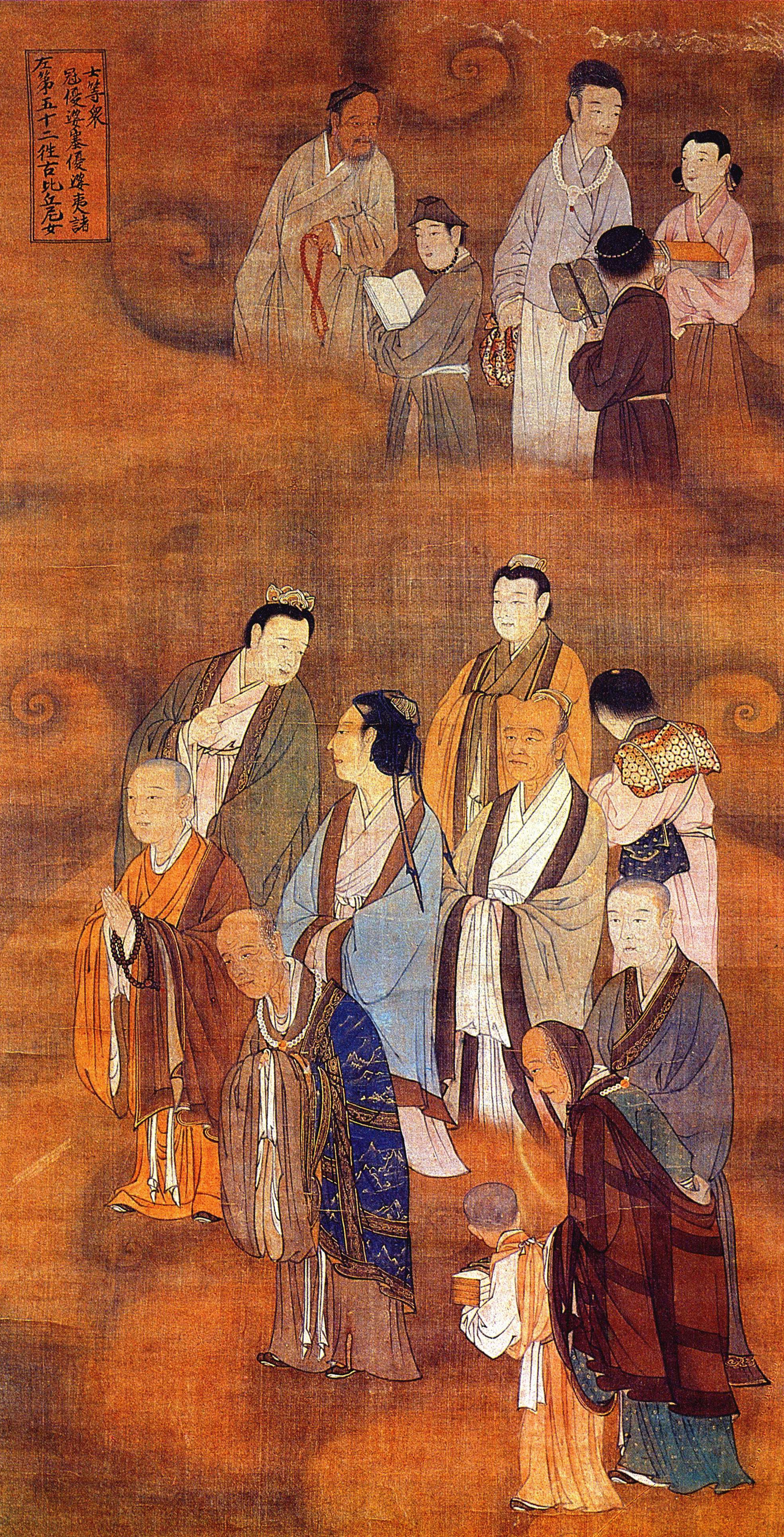 此画描绘佛教和道教的男女信徒。 下层为佛教的僧人和信徒, 剃发的比丘尼即佛教的女僧人, 也称尼姑。留 发的优婆塞、优婆夷为佛教的善男和信女。 上层为道教信徒, 道士与女道士, 女道士也称女冠。