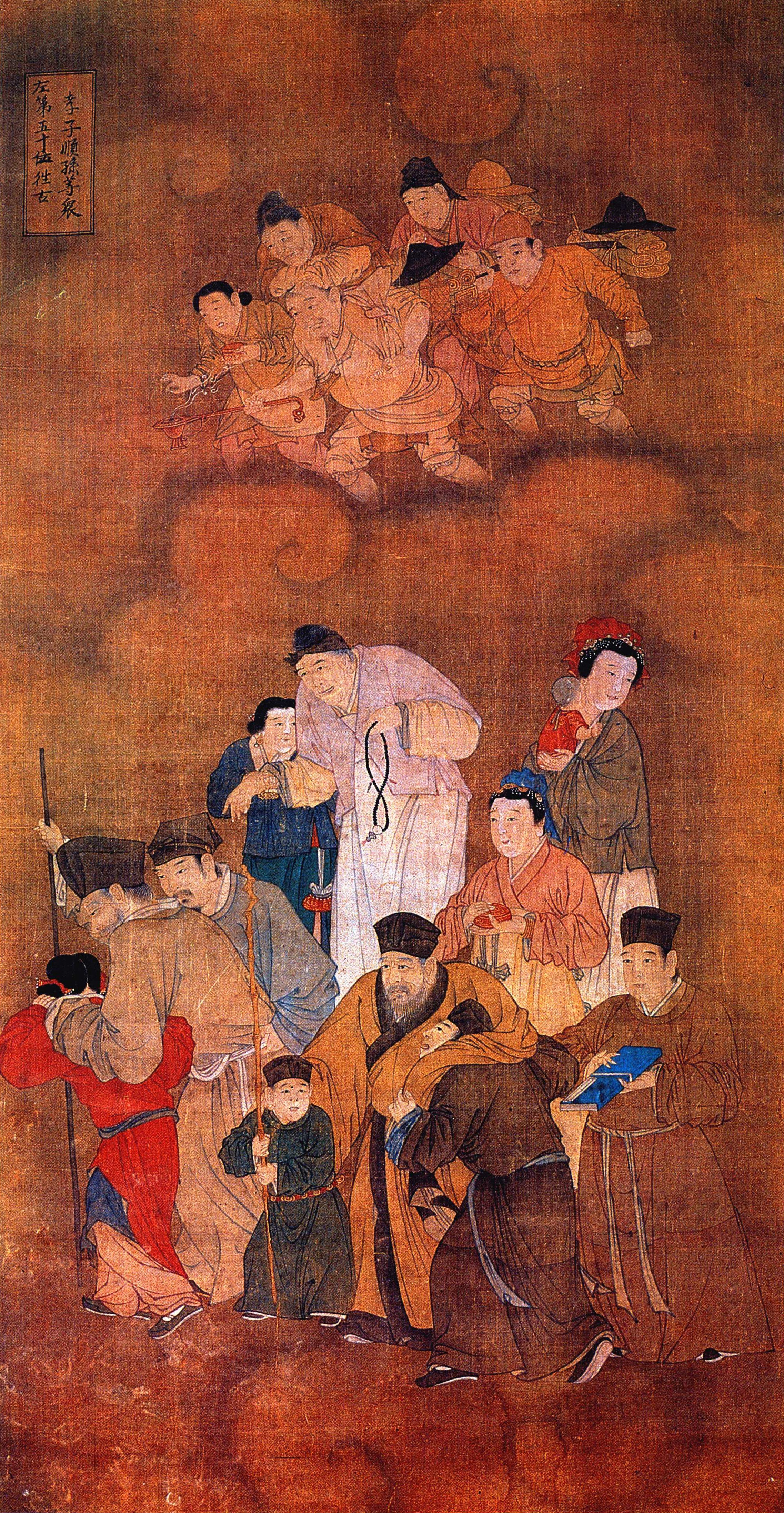 如第159一160 幅孝子顺孙等众,画分上下两层,上层共五人,一男子身负老妇,其余挑担背筐,仓惶逃遁,后面似有追兵追赶。下层十二人, 似为几个不同家庭的成员,其中三个老人步履艰难,子孙从旁小心扶行进; 一少妇怀抱婴儿,婴儿依偎在母亲的胸前,母亲对怀中的婴儿充满了爱抚之情。这幅画表现了“哀哀父母,生我劬劳”的主题,描绘了普通人民父母与亲子之间的深情, 青年母亲的慈爱和子女对老亲的体贴与关怀, 都表现得恰如其分, 自然而真实。