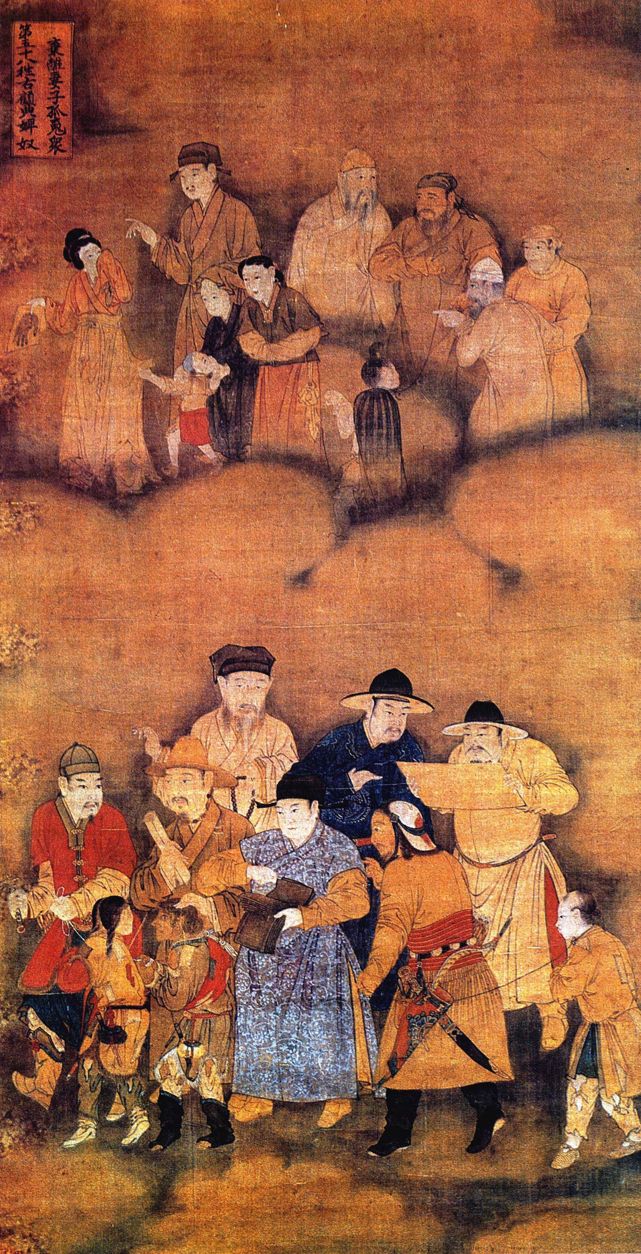 其次为人物画, 作者根据各种不同人物的身份予以刻划, 对男女老少、正邪美丑, 均能表现得恰如其分。 如帝王、 后妃都画得面容丰腴, 体态端庄, 服饰华丽, 色彩秾艳, 表情矜持; 武臣将士则着重表现其勇猛威武的神情; 画僧、 尼、 道、 冠则外表虔诚, 内心恬淡, 缁衣道 貌, 落拓不群; 儒者、 贤士和 文人画家, 各具情态, 儒者或着各色官服, 或穿便装, 褒衣博带, 负琴背剑, 仪态雍容。 内中一画家, 手持画像一幅, 正与人把臂攀谈, 表情生动。 九流百家, 包罗尤广, 上画士农工商、 医卜星相。 士负剑; 农荷锄担食; 工为木工, 背负工具; 商为挑担小贩; 医人、 卜者均有明显的职业标记, 一望可知。 下为戏剧、 百戏演员。 戏剧人物包括生旦净丑末, 生着圆领长袍, 翘翅幞头, 手执书卷; 旦着小袖上衣、 短裙, 下露纤足; 净上身裸体文身; 丑短须浓眉, 头戴短舒翅幞头, 身着长袍; 末则长须裹巾, 身穿补缀长衫。 百戏人物, 装束奇特, 或穿外氅, 或披狮形外衣, 或背长鼓。 一壮士头裹巾, 上身赤膊, 下着短裤; 手持三环,旁立一侏儒, 双手抱一小口高体瓶; 中一人身穿圆领皂袍, 手中握笔,正在与人交谈, 似为班主。 这幅画,人物种类繁多, 对研究中国古代社会风俗、社会经济状况、 服饰、 戏剧等都有重要的参考价值。