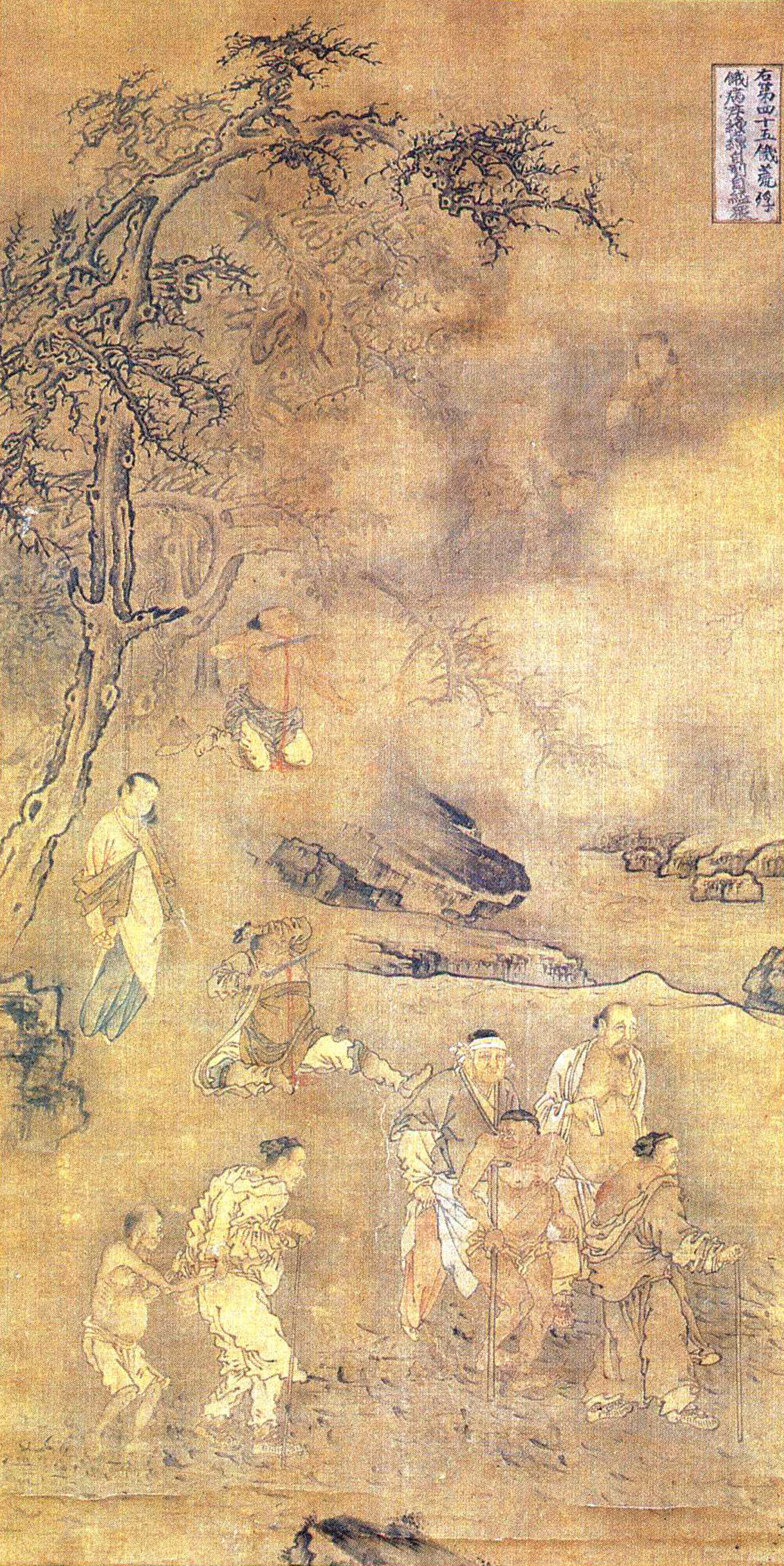 此画描绘人民由于荒灾和各种原因所遭受的苦难。 有的吊死树下, 有的举刀自刎, 有的尚在痛苦中挣扎。 骨瘦如柴的饥民被疾病折磨得无复人形, 奄奄待毙, 状极凄惨。 画家用杈桠枯树大斧劈皴法画山水配景, 用运笔急遽的战笔水纹描法画饥民的衣纹, 更衬托出悲惨的气氛。 画的右上角云雾中, 有一妇女和手提头颅的无首男子, 系死者灵魂的显现。